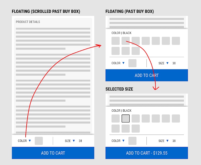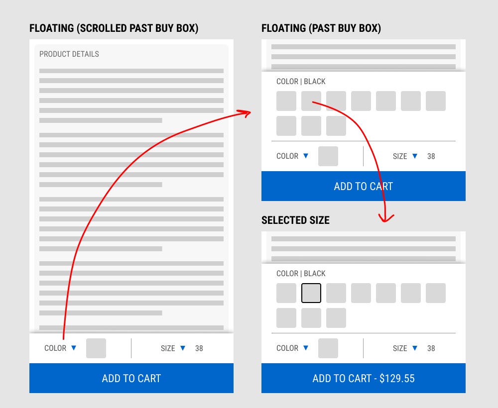 The floating add-to-cart widget had another layer of complexity in that it allowed customers to make a size and color selection with an expandable fly out. Making a selection would also append the total price to the add-to-cart button label.