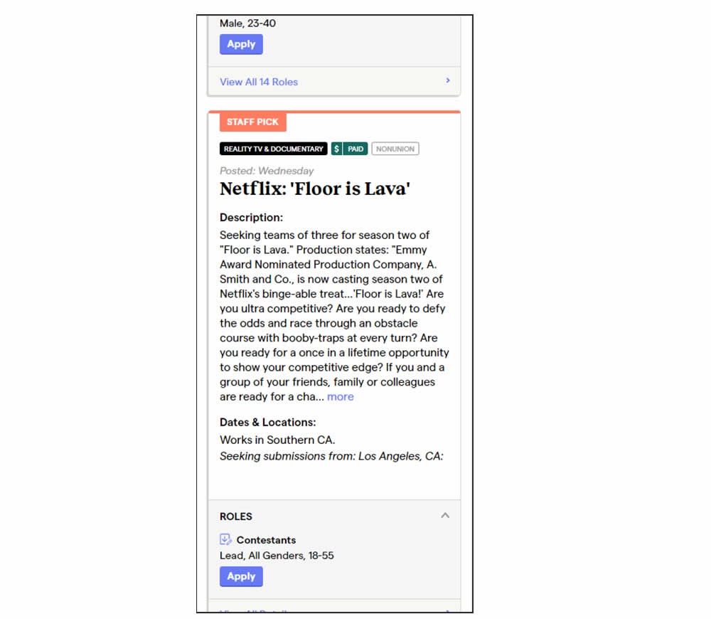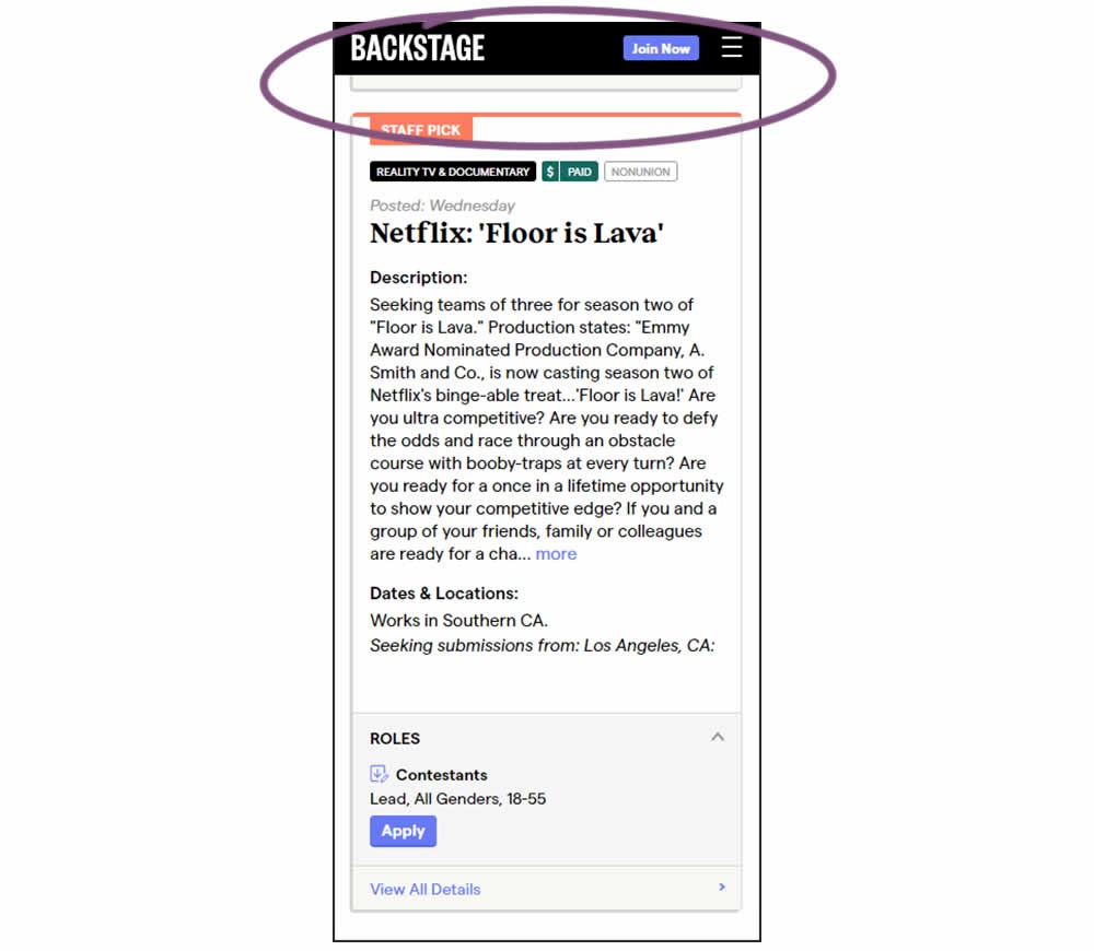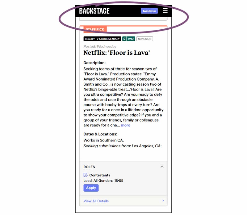 In this experiment, a floating top navigation was shown with a "Join" button. In the control, the navigation was only visible at the top of the page. Also keep in mind that signup starts were also triggered throughout multiple CTAs throughout the page and from particular job detail pages. The a/b test ran on a listing page of Backstage - a casting call job site. Impact on signups  and checkouts was measured.