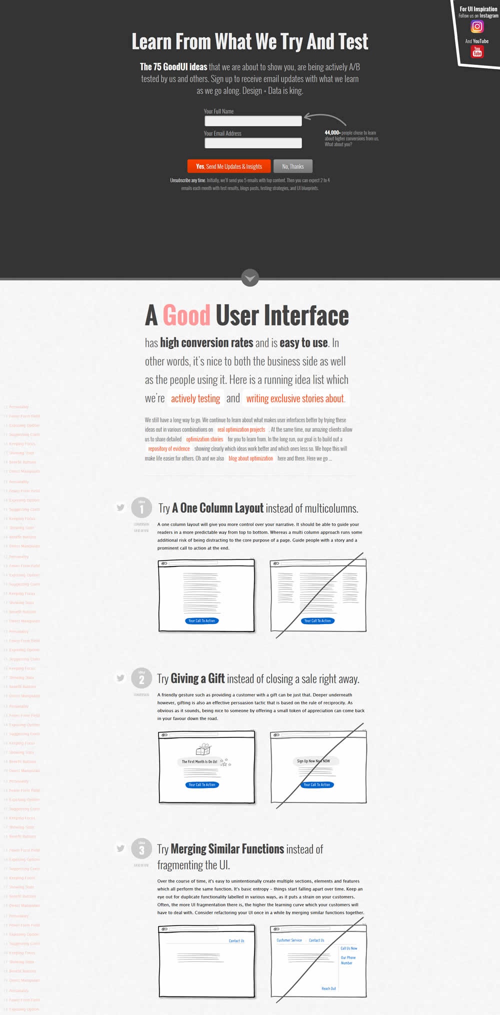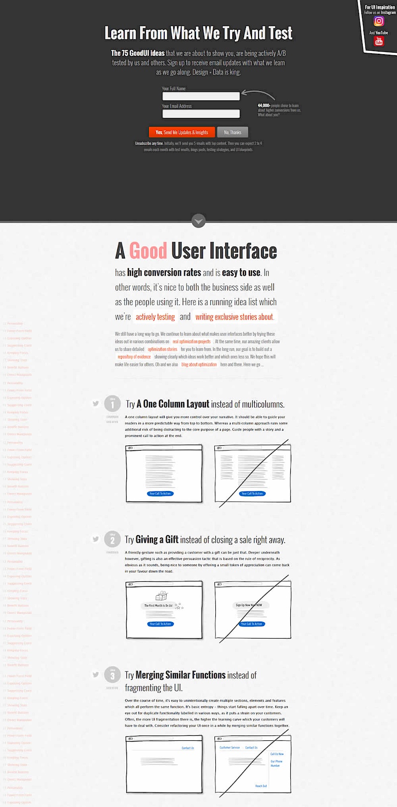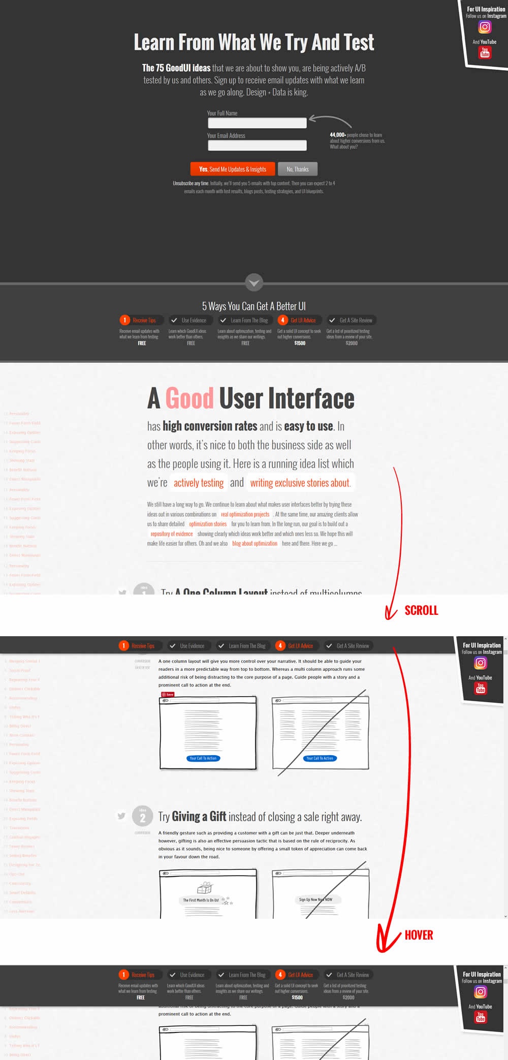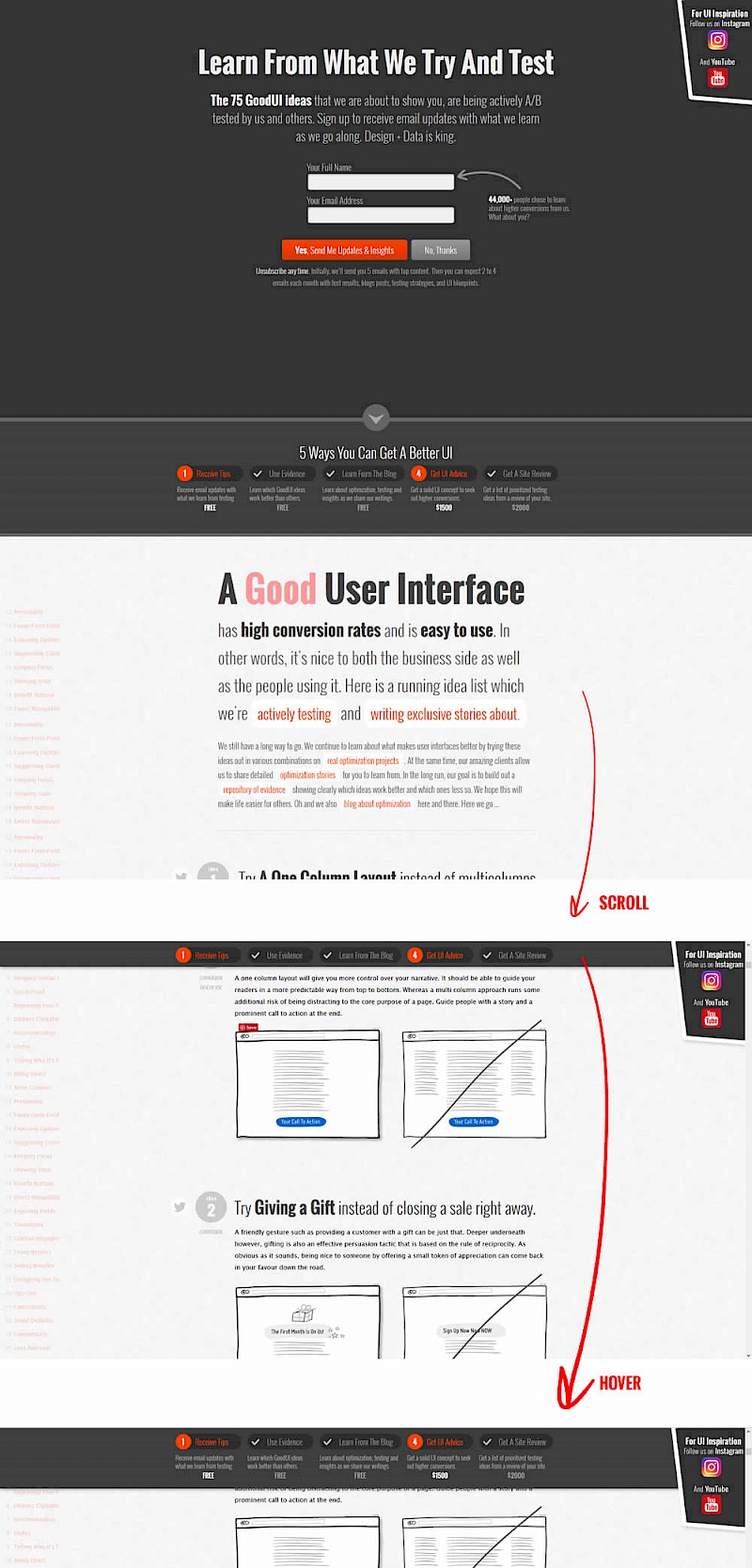 In this experiment, we showed a sticky navigation bar with 5 actions such as (newsletter signup, and visiting certain landing pages). Upon completion of each task, the navigation would transform into a completed state while using cookies to store it for future reference.
