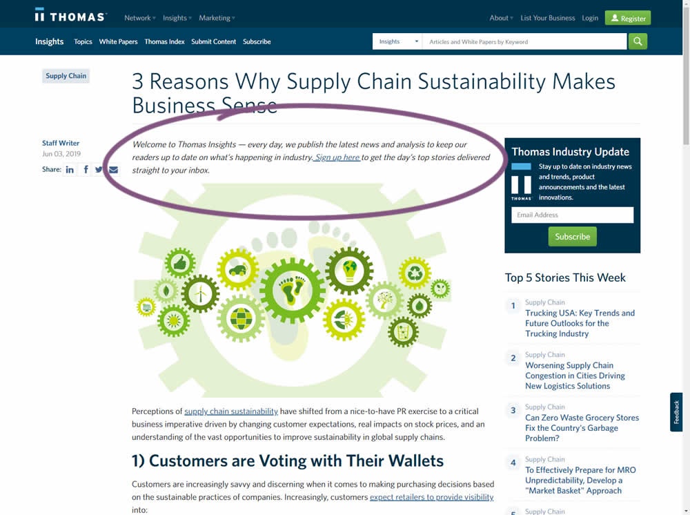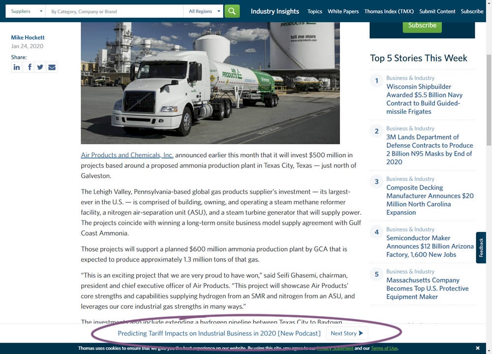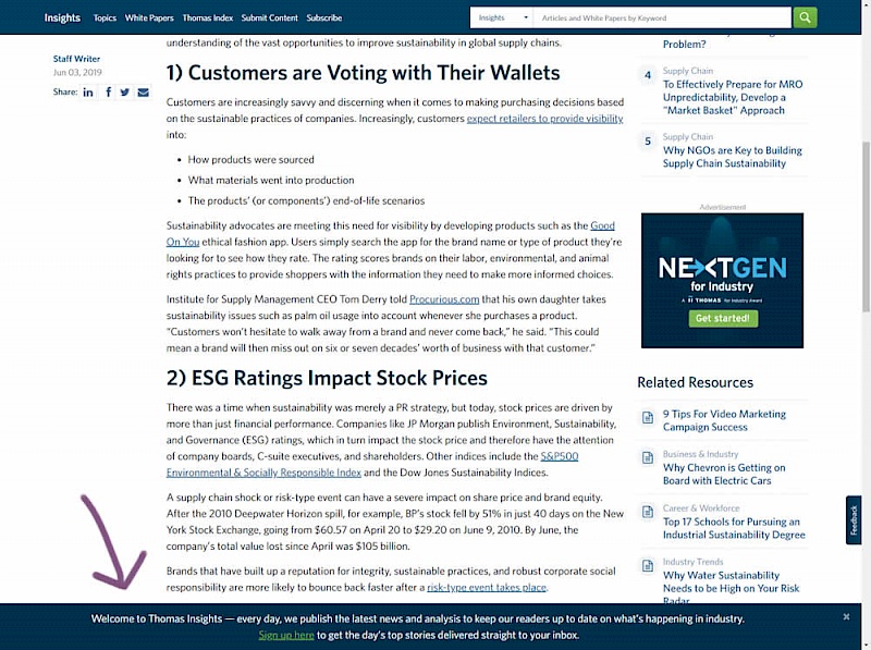 In this experiment, the same message (with a link) for signing up to a newsletter was shown in two distinct ways. The control (A) showed the signup message as inline one that preceded the content of the article at the very top. The variant showed the same signup message as a scroll-delayed sticky interaction at the bottom of the screen. The background color of the B variant was also inverted to match the style of the footer.