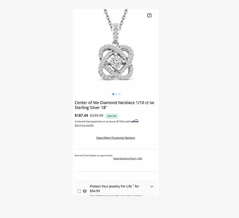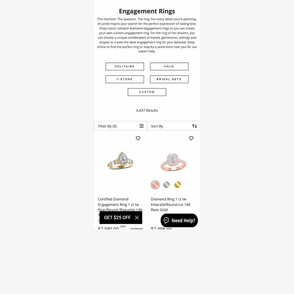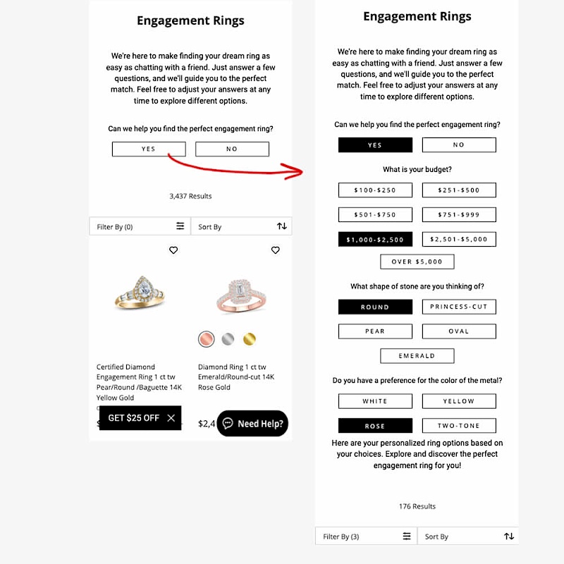 In this experiment, conversational filters were tested at the top of some listing pages. Instead of showing one set of product filters, customers were shown three sets of product questions. After selecting each answer, product results would narrow and update further down on the page. Impact on adds to cart and sales were measured.