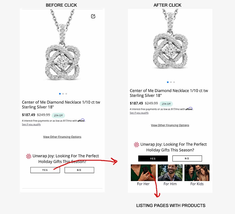In this experiment, product pages (variant) asked users if they were interested to see holiday gifts with two buttons. Upon clicking "yes", the UI expanded to make another choice in order to see gifts for: Her, Him or Kids. Clicking any of these three would send users to dedicated listing pages with more product recommendations. Impact on sales was measured.
