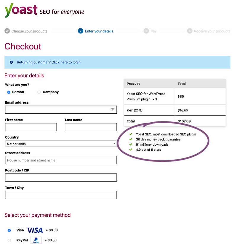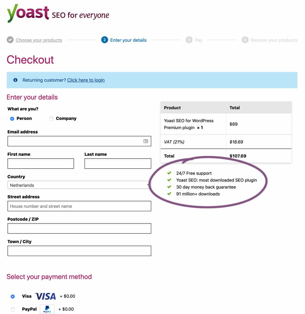In this experiment, the Yoast team replaced one of the bulleted reassurances on their checkout page ("4.9 out of 5 stars" vs "24/7 Free support"). Raising the question - is free support or high reviews valued more? - Thanks Sjardo & Meike for sharing!