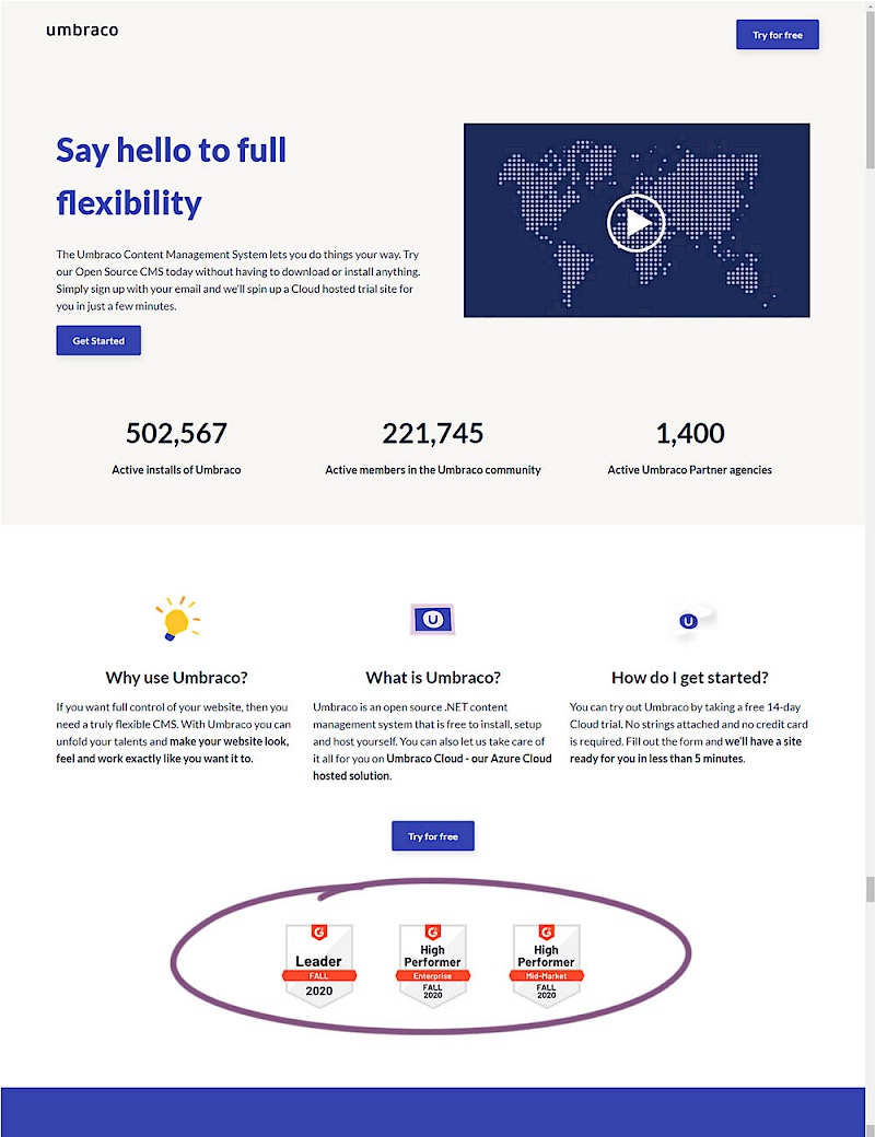 In this experiment, the variation added three G2 badges or awards. The intent was to measure the impact of this change on signups for Umbraco.