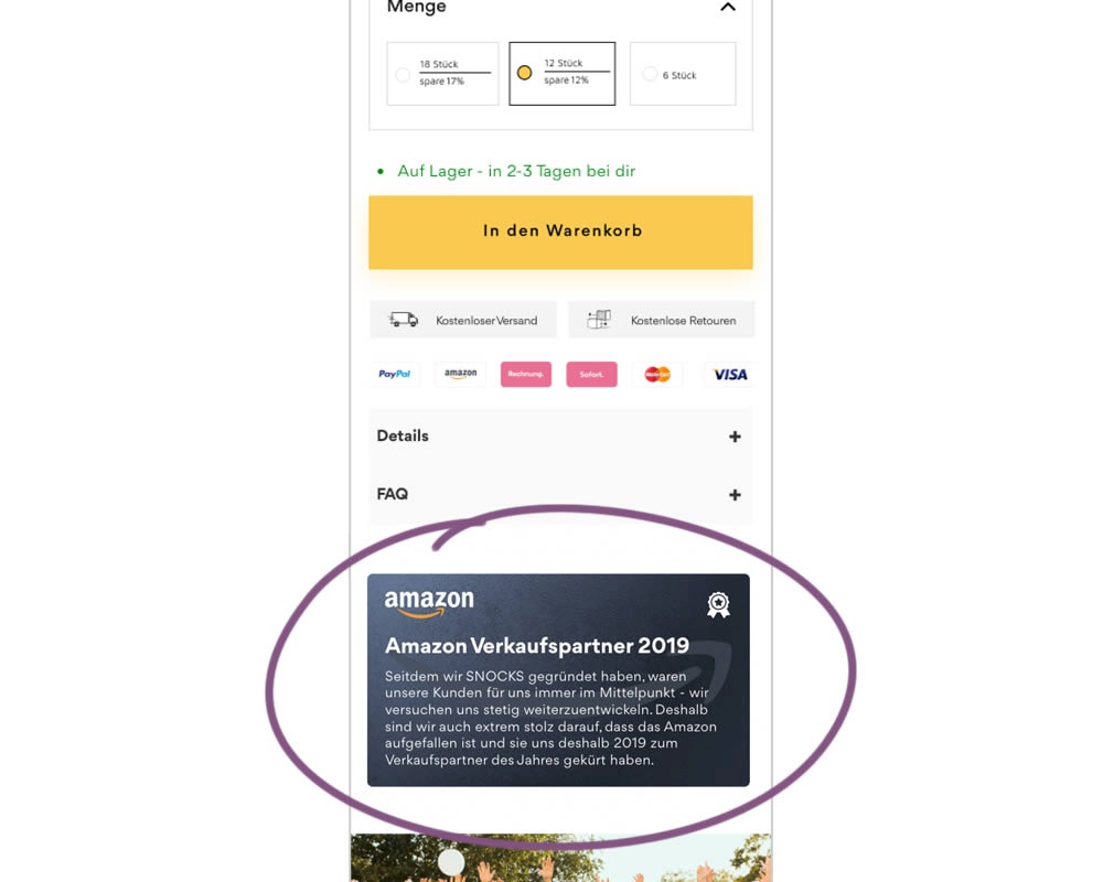 In this experiment, a simple Amazon badge was added on a product page. The translated (Google) language read: "Since we founded snocks, our customers have always been our focus - we are constantly trying to develop further. That's why we're extremely proud that Amazon attracted attention and that they named us Sales Partner of the Year in 2019."