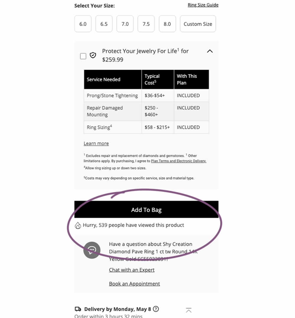 In this experiment, a social proof message was added below add to cart buttons on product detail pages. The copy read "Hurry, X people have viewed this product". Impact on adds to cart and transactions was measured.