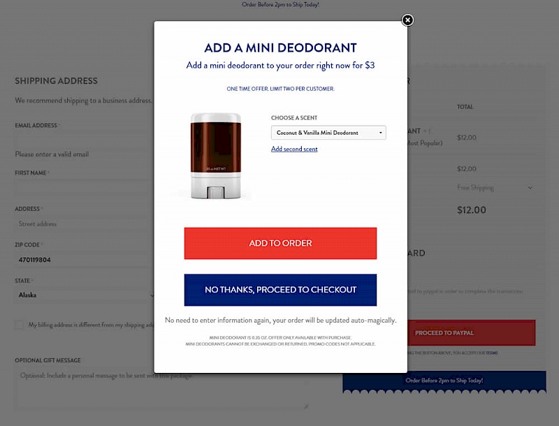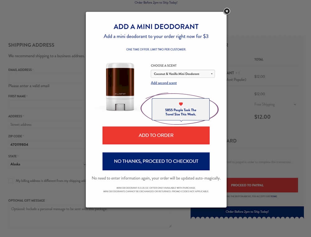 In this test the upsell modal had an added text box with number of people that day who took the offer. The test hypothesis was that social proof will add motivation to take an action and the offer.