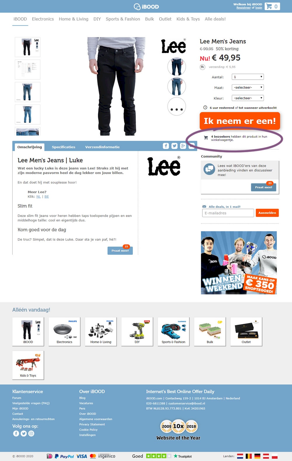 In this experiment, realtime social proof information has been added below an add-to-cart button. The variation shows how many users that have viewed, or placed a product into their basket. Translated to "4 visitors have this product in their shopping cart."