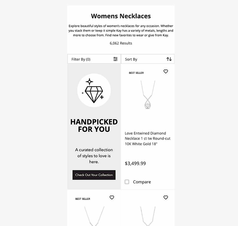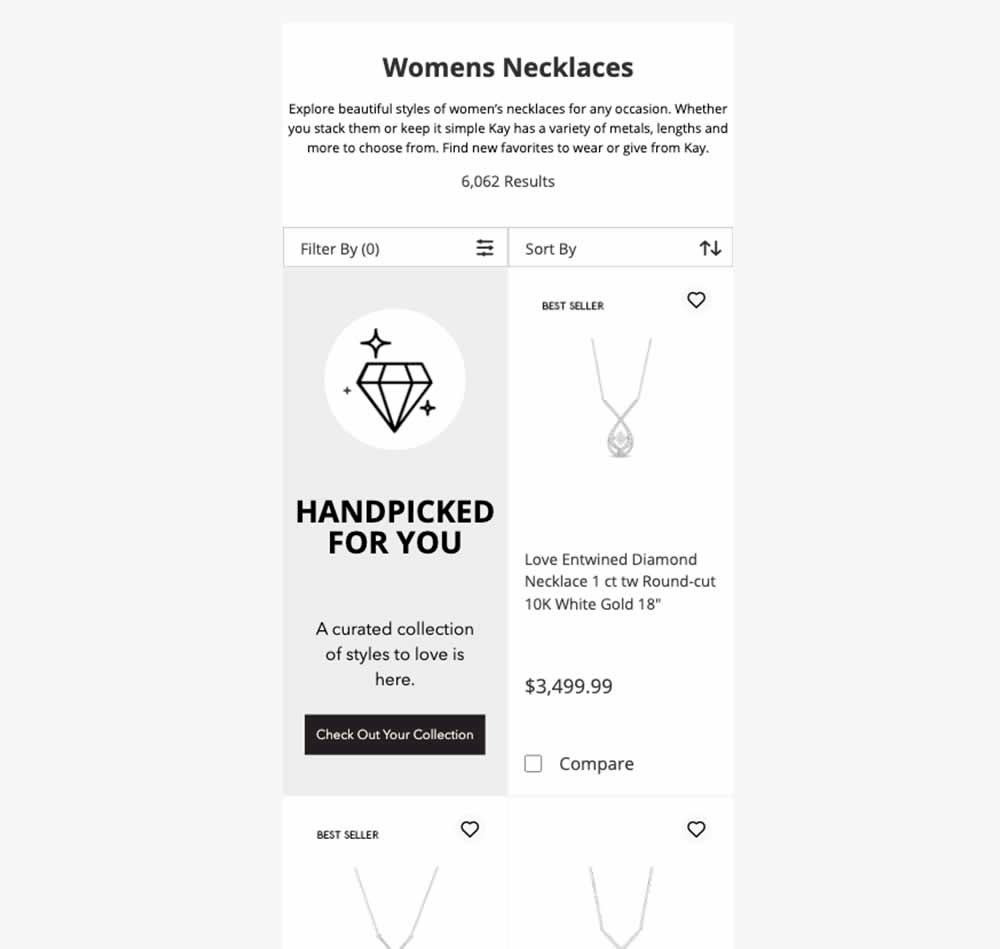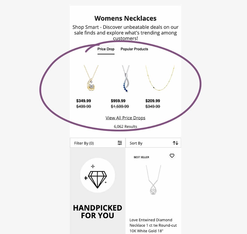 In this experiment, additional (discounted) products were shown at the top of category listing pages with a link to see more such products ("View All Price Drops"). Impact on overall sales was measured.