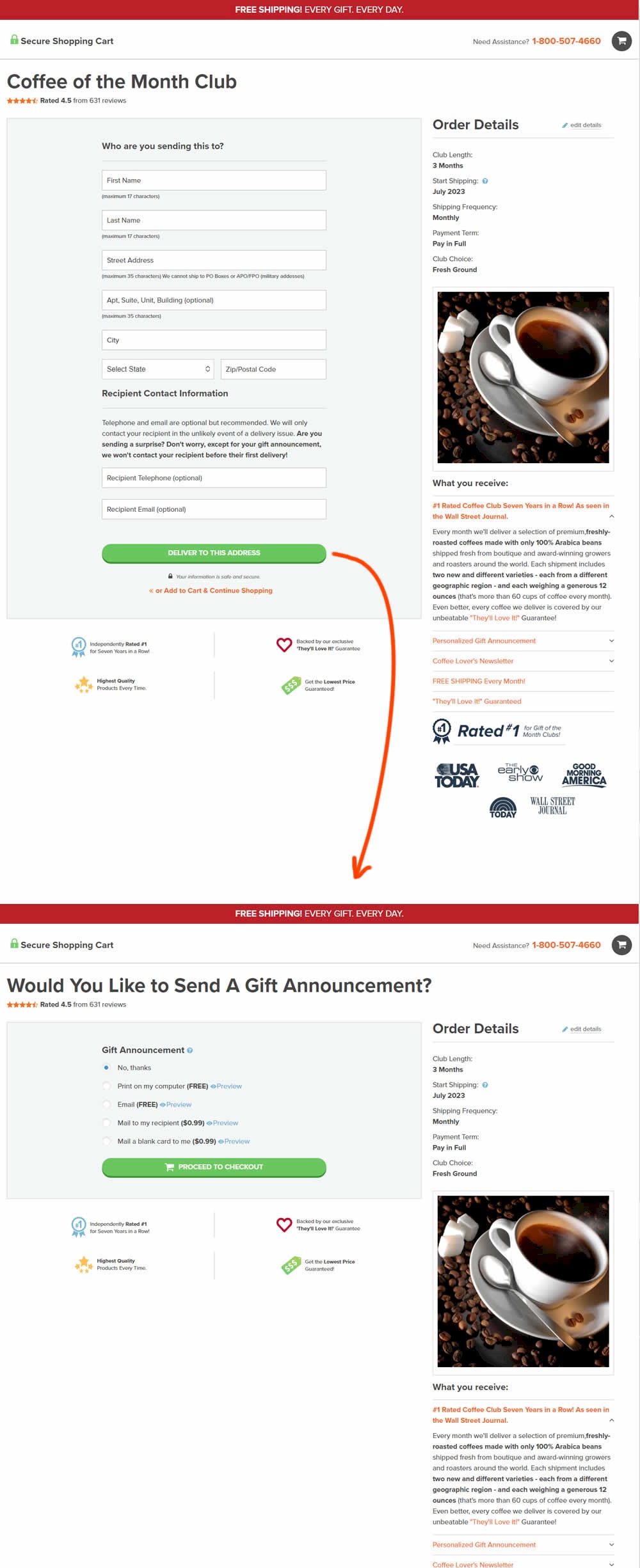 In this experiment, a section dedicated to choosing gift messages was taken out and separated into its own individial step. The change happened on the first step of a checkout flow and increased the flow by an additional step. Impact on checkouts and total sales was measured.