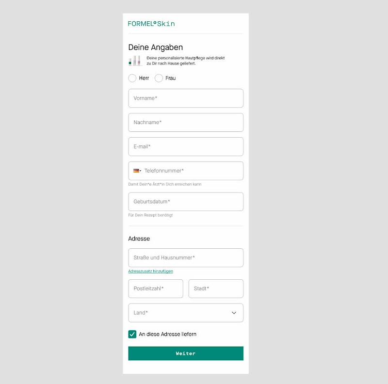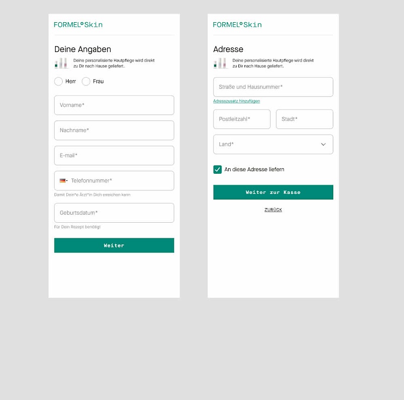 In this experiment two sections of a form on a single page (control) were broken out into 2 separate steps (variation). The two sections included personal details and shipping information. This step appeared after having received a product recommendation when filling out a questionnaire for a skin care product. Impact on next step progression and purchases was measured.