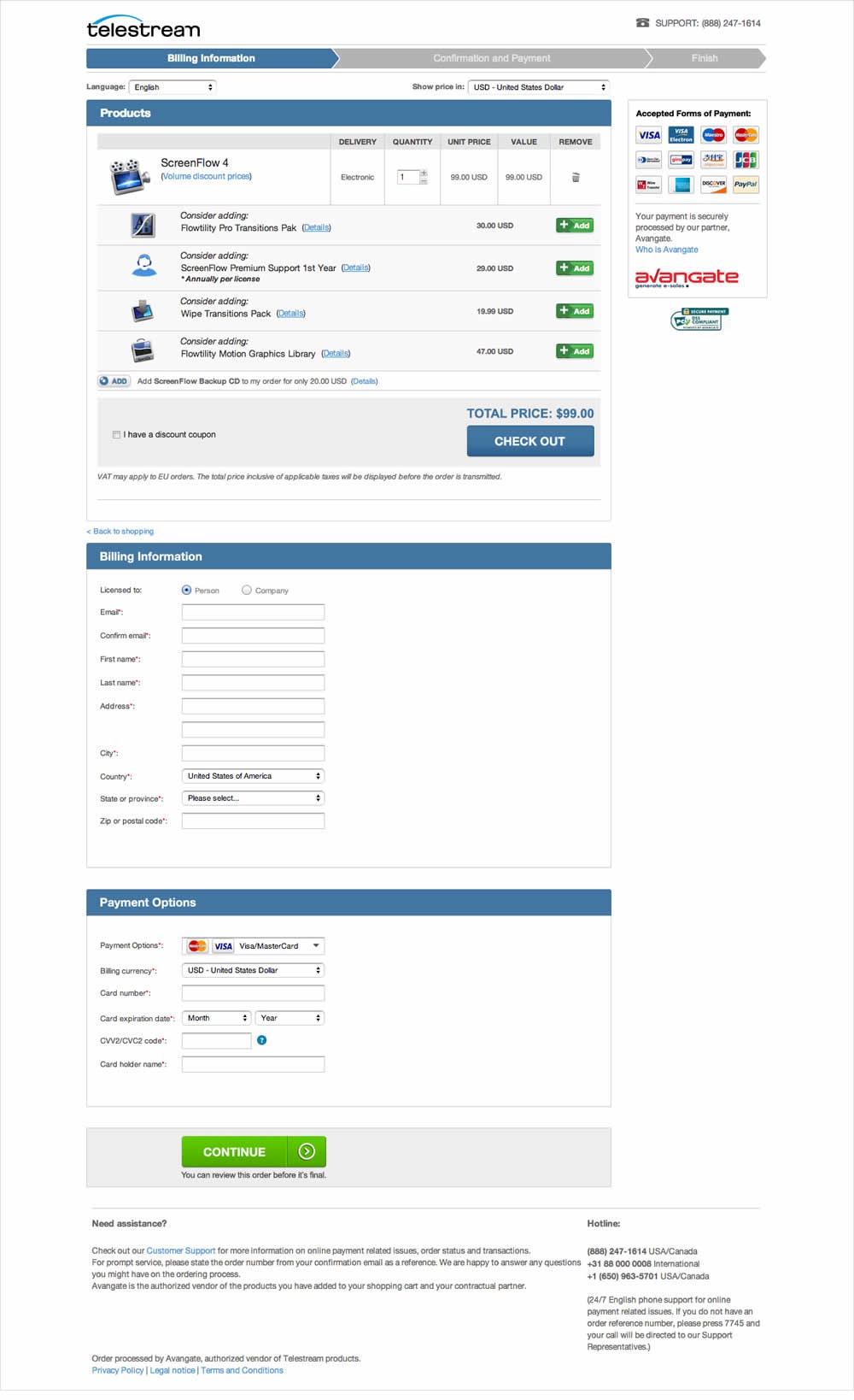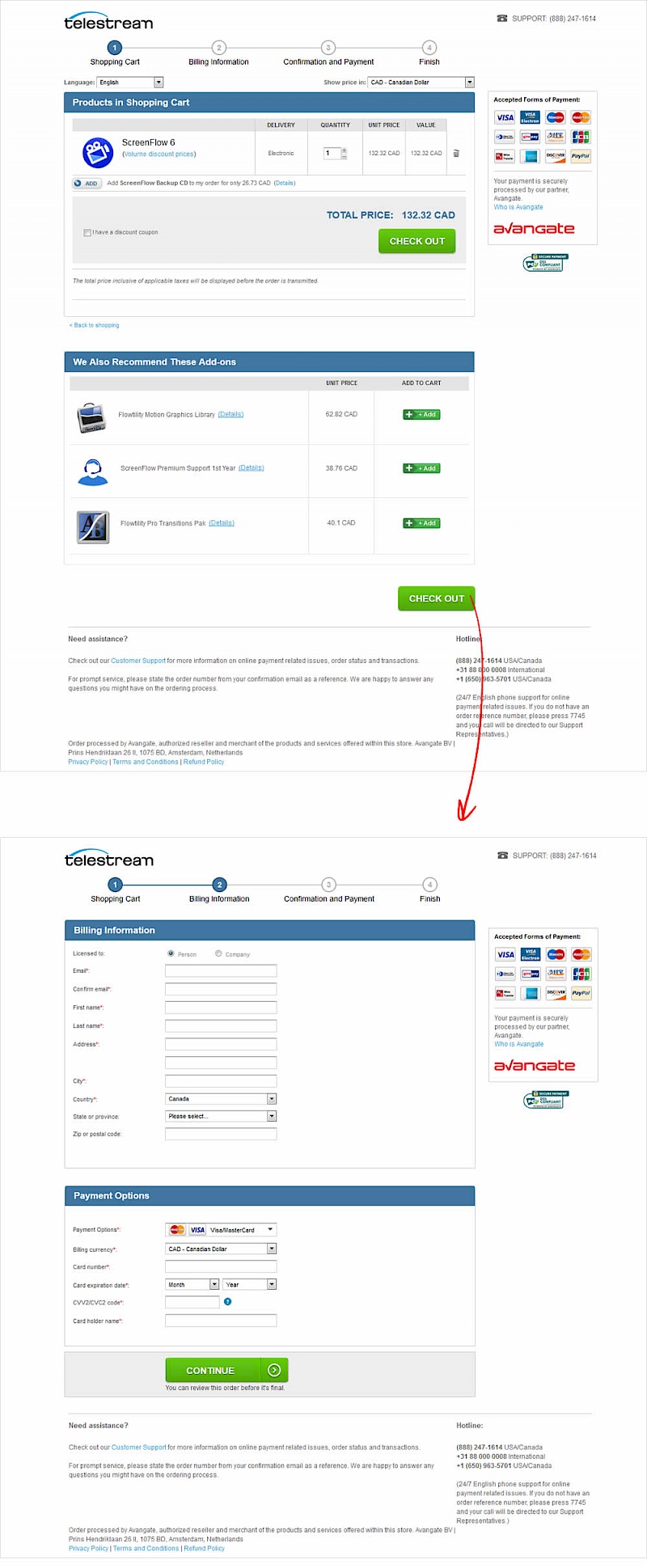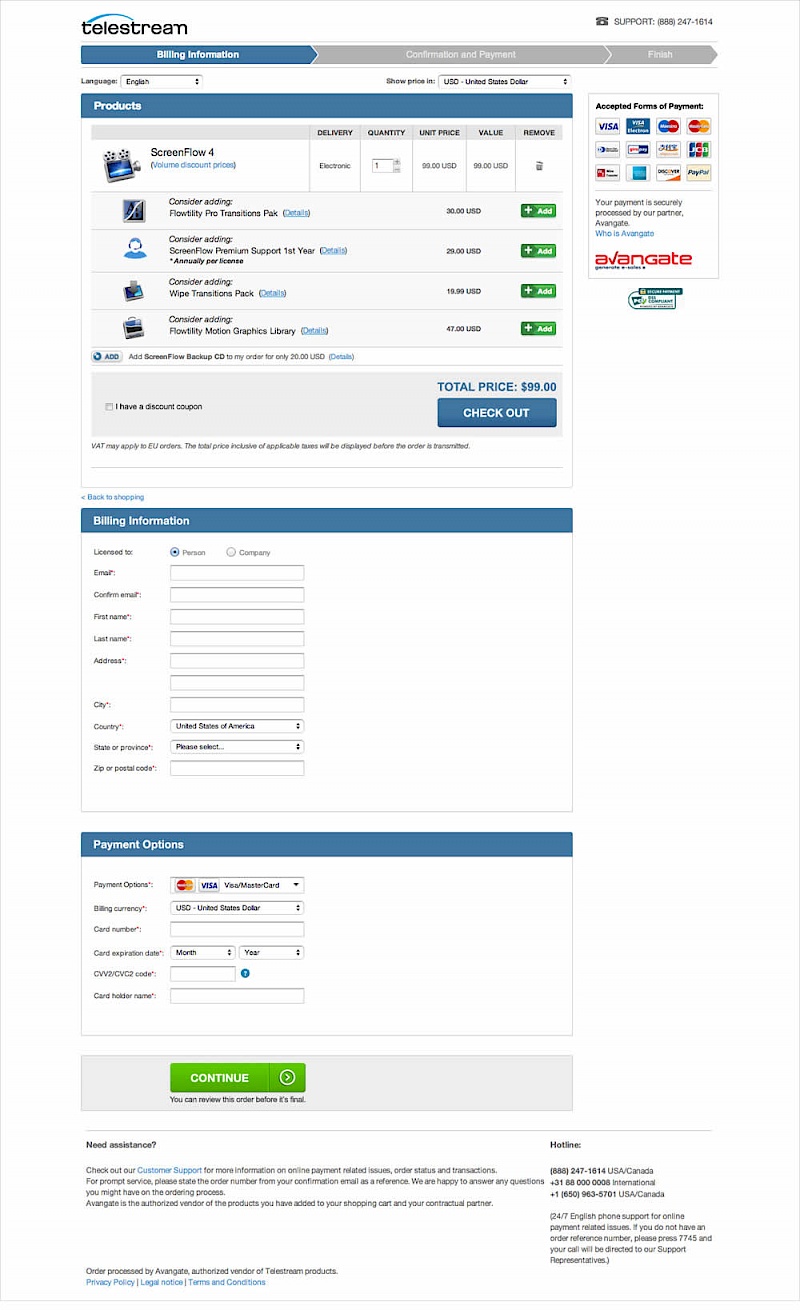 Telestream specializes in software that make it possible to get video content to any audience regardless of how it is created, distributed, or viewed. Telestream’s customer acquisition strategy is centered around driving traffic to their website to trial, or to purchase from their online store. Shoppers can buy software online, download it right away, and immediately start using it. The variation was designed with the same information as the control except spread across 4 steps (instead of 3). The rationale was that each step would be shorter and less overwhelming for the user.