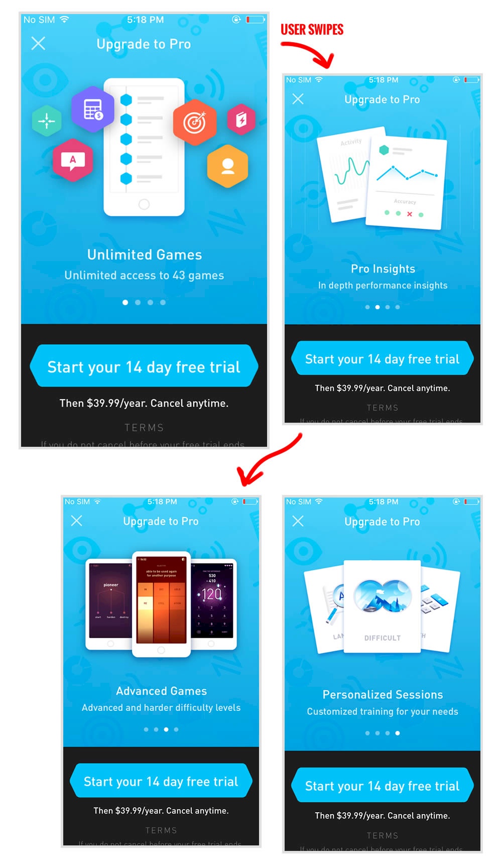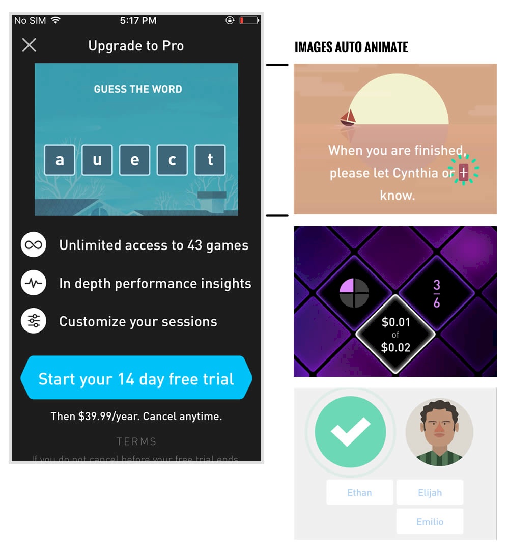 This experiment tests the impact of a different paywall screen on iOS. The current control paywall screen for 100% of iOS users was the animated pro screen. In this screen, users see an animation that gives shows glimpses of several Elevate games in action, as well as a bulleted list of key selling points for Pro. The proposed change (variant B) features a swipeable carousel of pages where each page has an image and some accompanying text explaining a different benefit of subscribing to Pro. The hypothesis is that we can lift conversion by showing users the alternate swiping paywall screen.