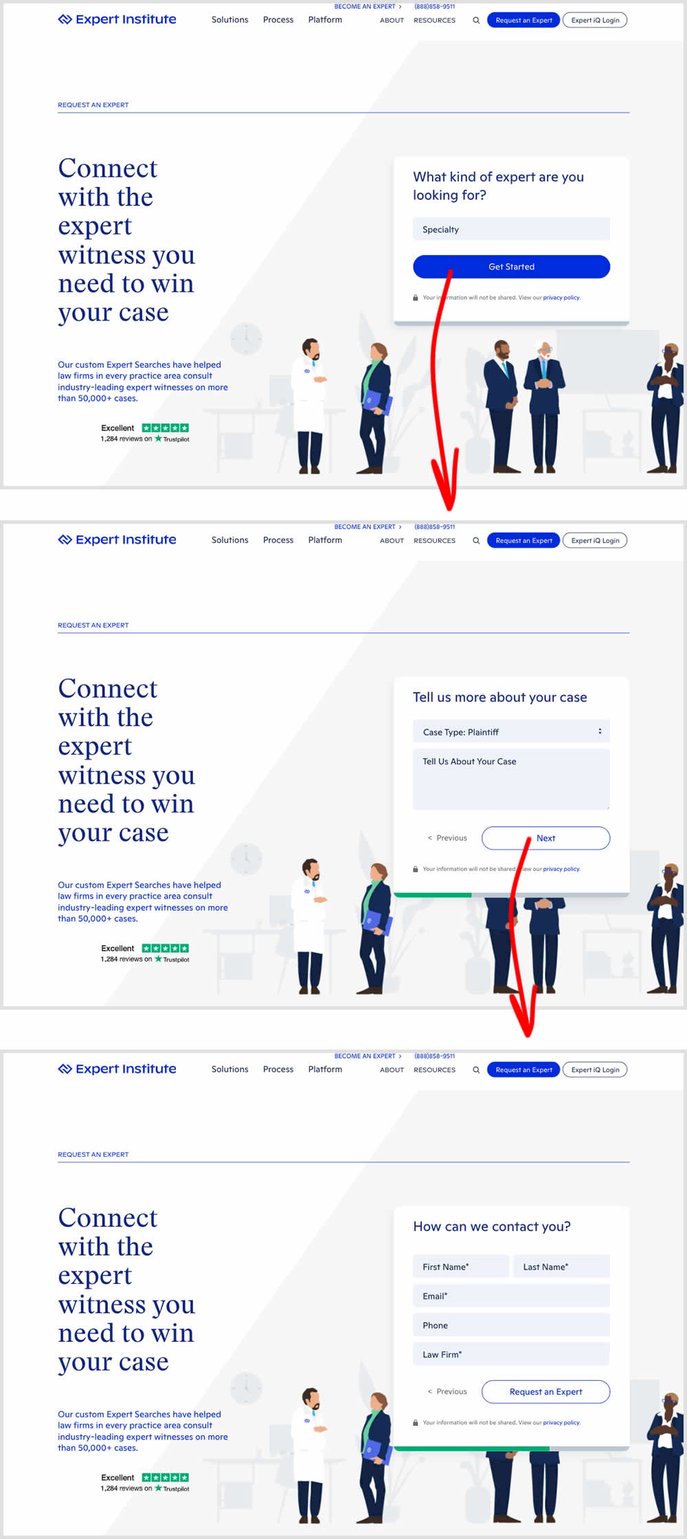 In this experiment, a lead form with numerous fields shown all at once, was broken down into 3 steps. The first step only asked for a Specialty choice that expanded into a list of options. Impact on full form completions was measured.