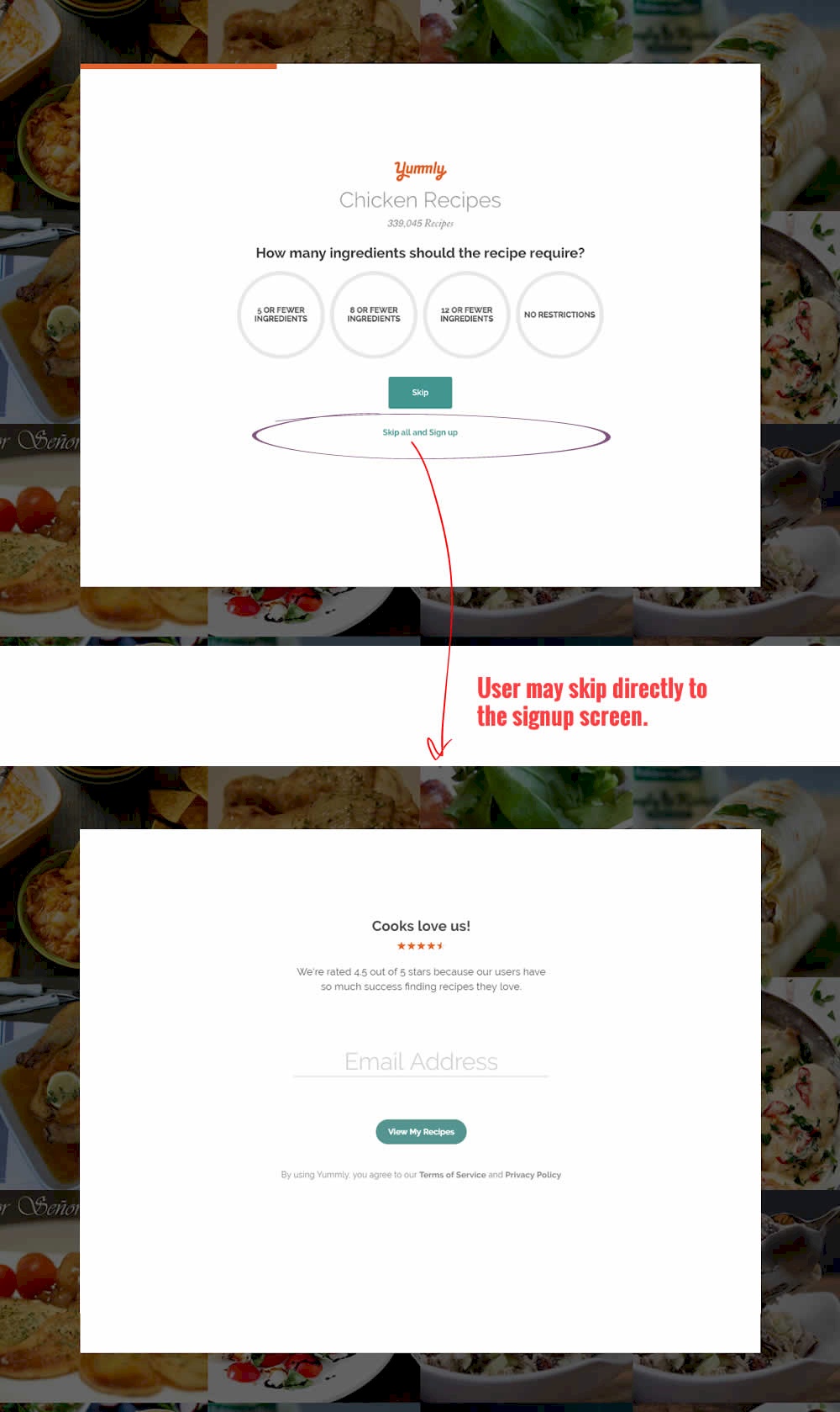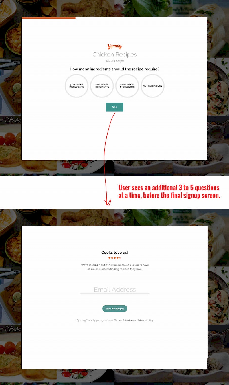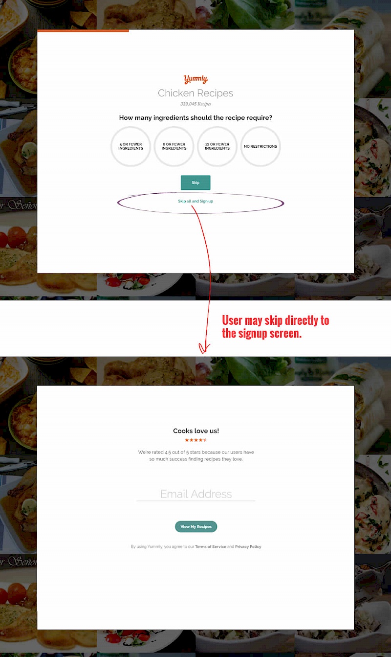 In this experiment, the presence of an additional "skip all" text link was tested on a multiple step signup flow. The skip all link allowed users to bypass personalization questions and go straight to their app dashboard. The control (A) shows its presence, and in variant B we can see it was removed.
