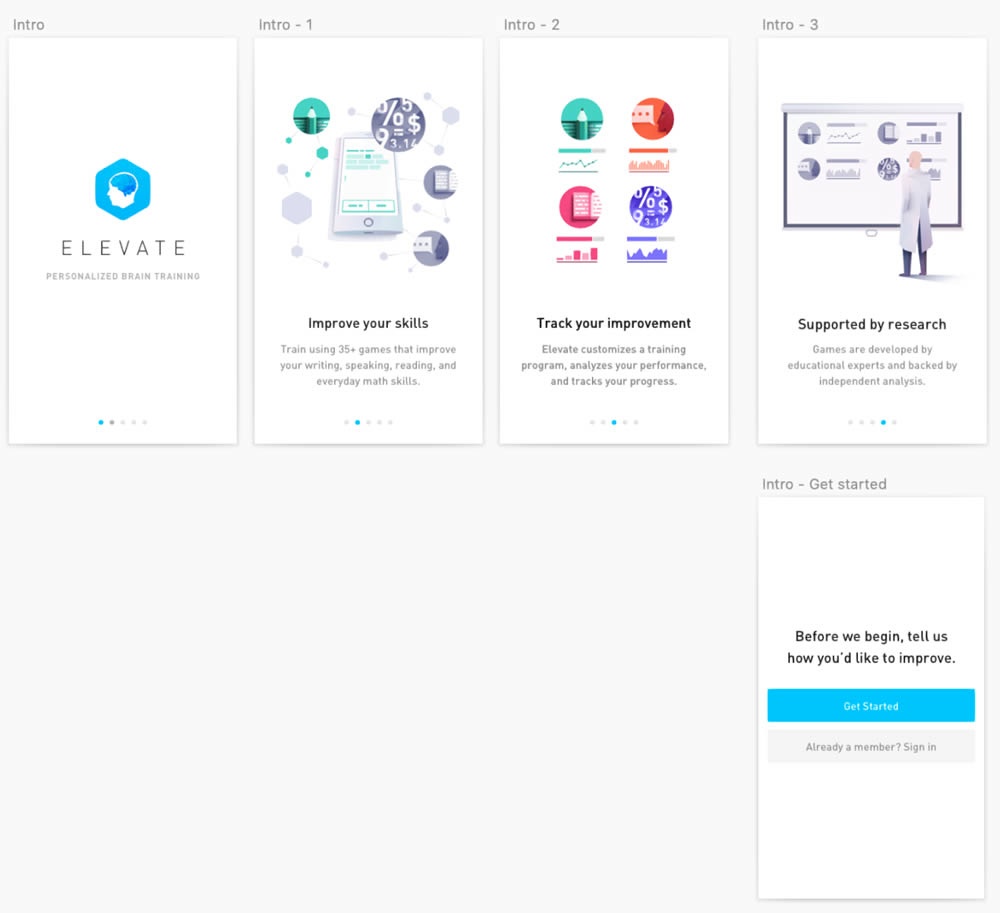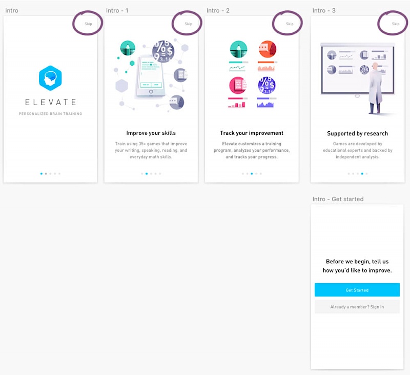 This experiment was ran on the initial onboarding screens of the Elevate App - right after installing and launching the app for the first time. The change was the removal of subtle "skip" links that fast tracked users to the signup/login screen (Get Started). Hence in the variation, all users had to scroll through the 4 introductory messages before being asked to create an account.
