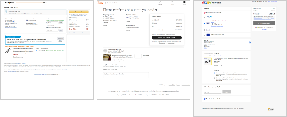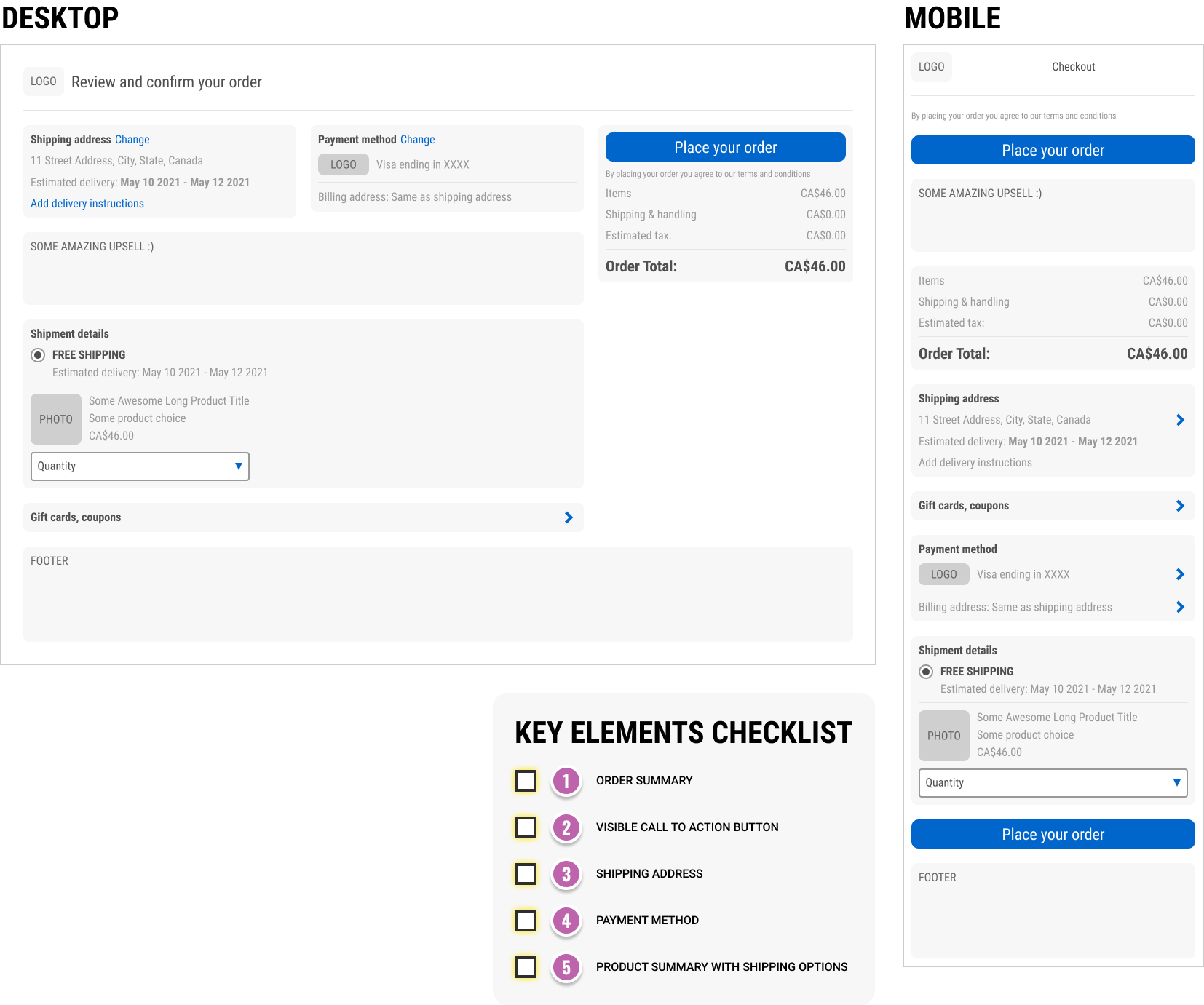 To design this template, we looked at desktop and mobile checkout screens of Amazon, Etsy and Ebay.