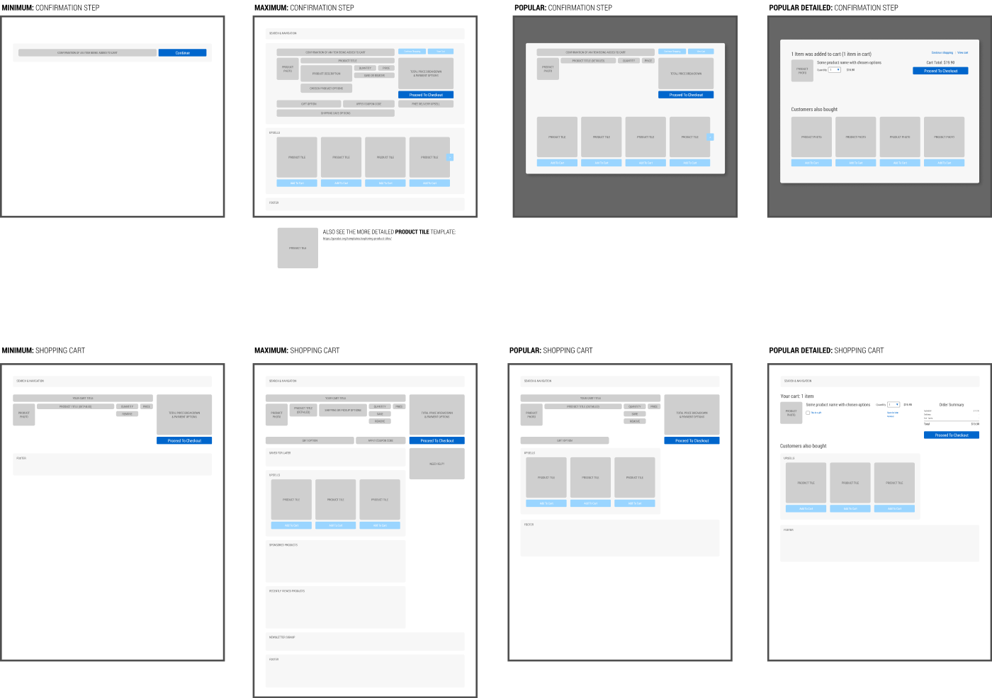 From this analysis, we have processed the UI of these 7 companies into 4 wireframe types: minimum, maximum, popular, and popular detailed for both the confirmation step and the shopping cart screen.