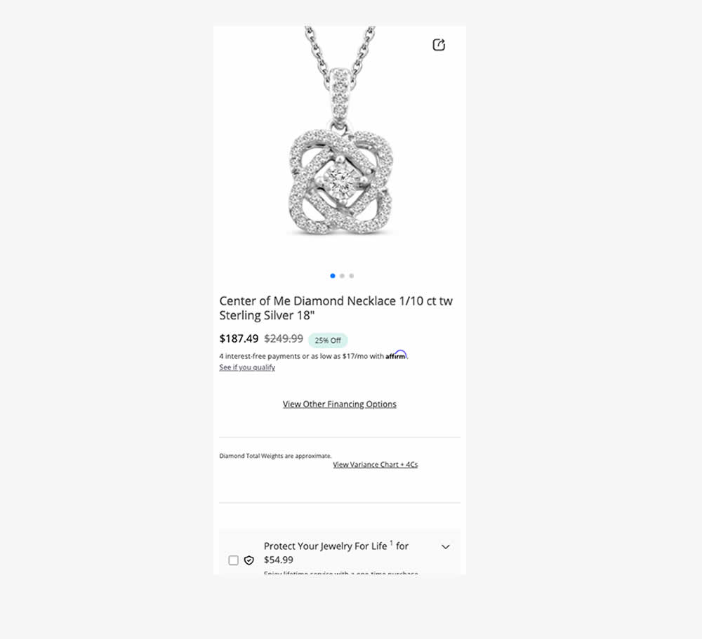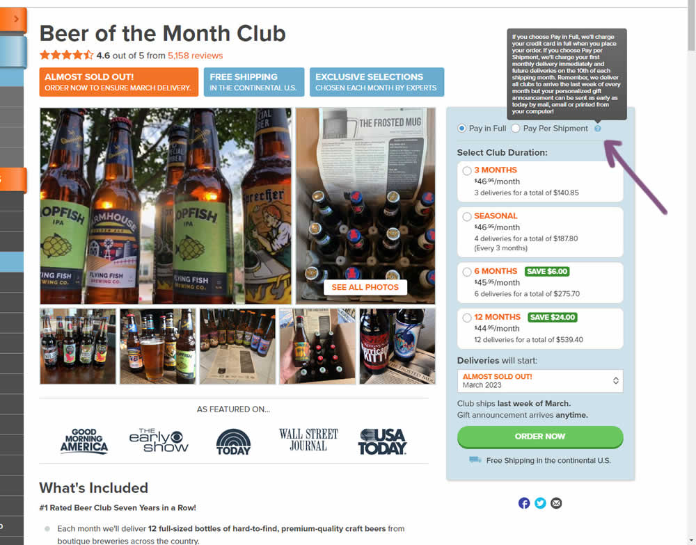 In this product detail page experiment, the variation showed a tooltip icon. Upon hovering on the icon it expanded additional information explaining the difference between pay in full and pay per shipment. Impact on sales was measured.