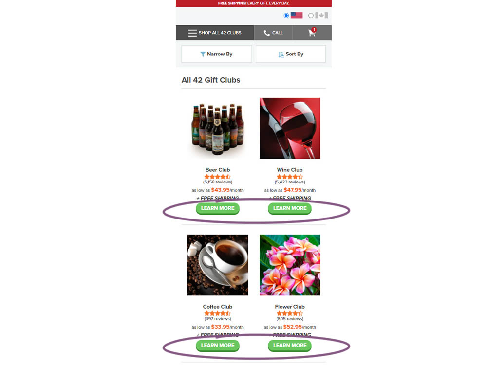 In this experiment, simple "Learn More" buttons were added underneath each product thumbnail. These buttons were additional triggers that linked to product detail pages on top of the existing thumbnails and product names (that also linked to the PDPs). Impact on product visits and sales was measured.