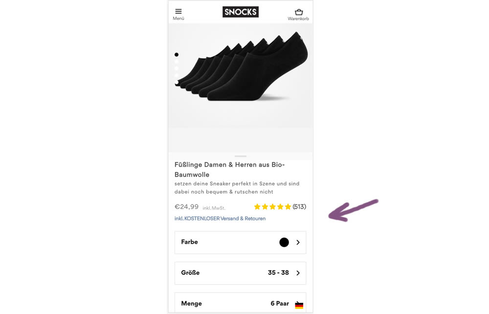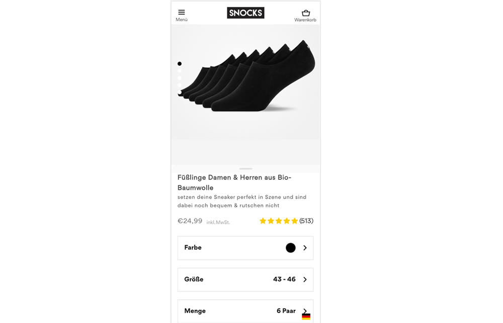 In this experiment, a simple Amazon badge was added on a product page. The translated (Google) language read: "Since we founded snocks, our customers have always been our focus - we are constantly trying to develop further. That's why we're extremely proud that Amazon attracted attention and that they named us Sales Partner of the Year in 2019."