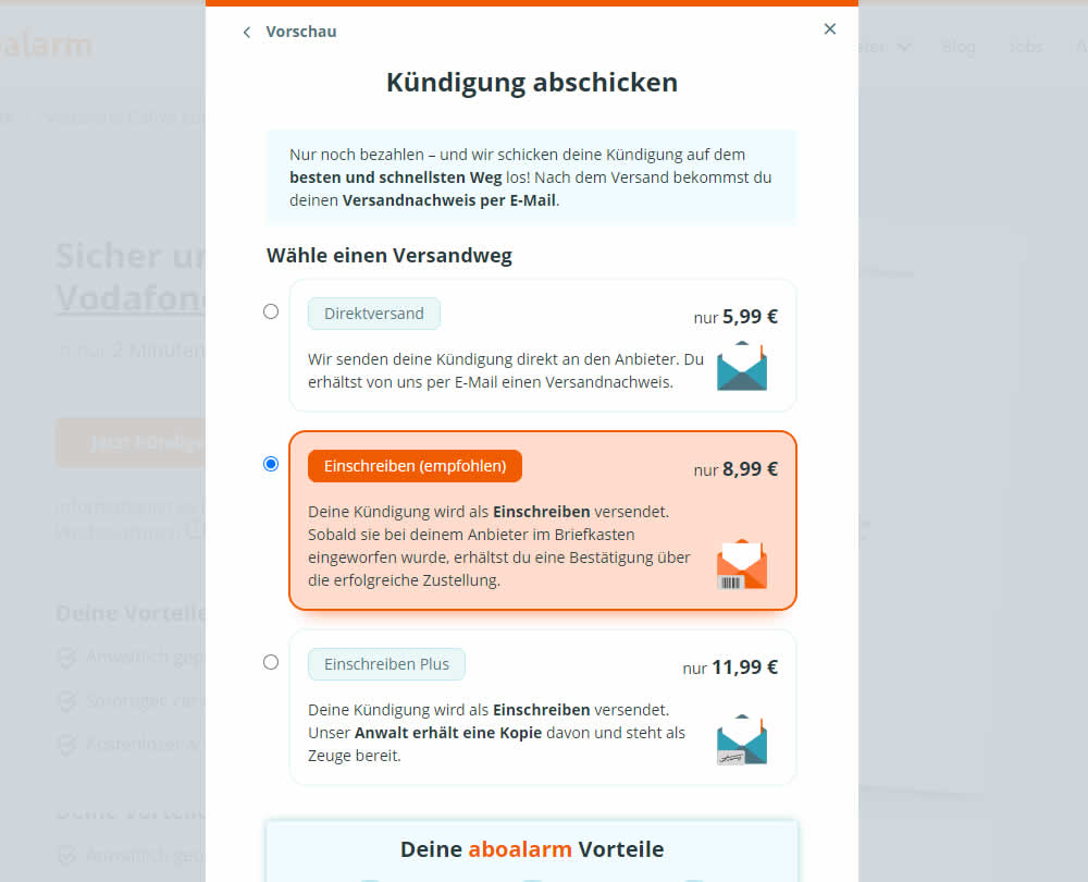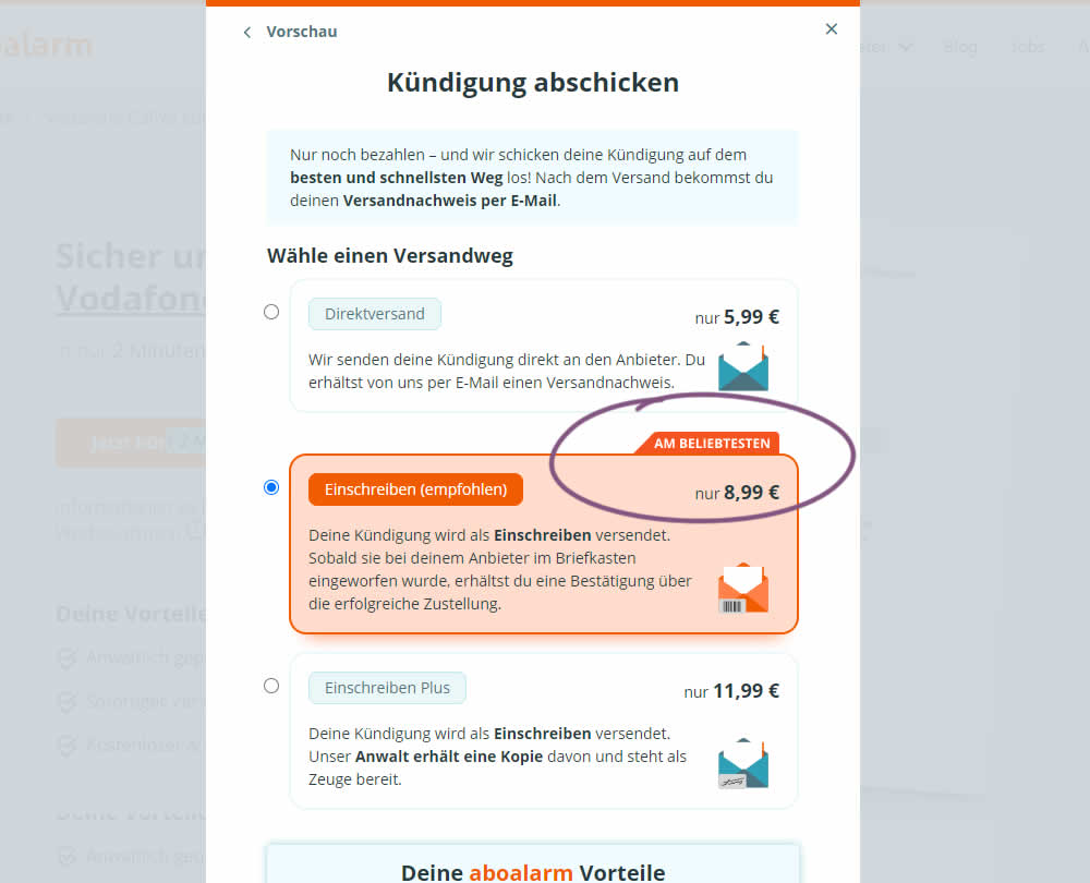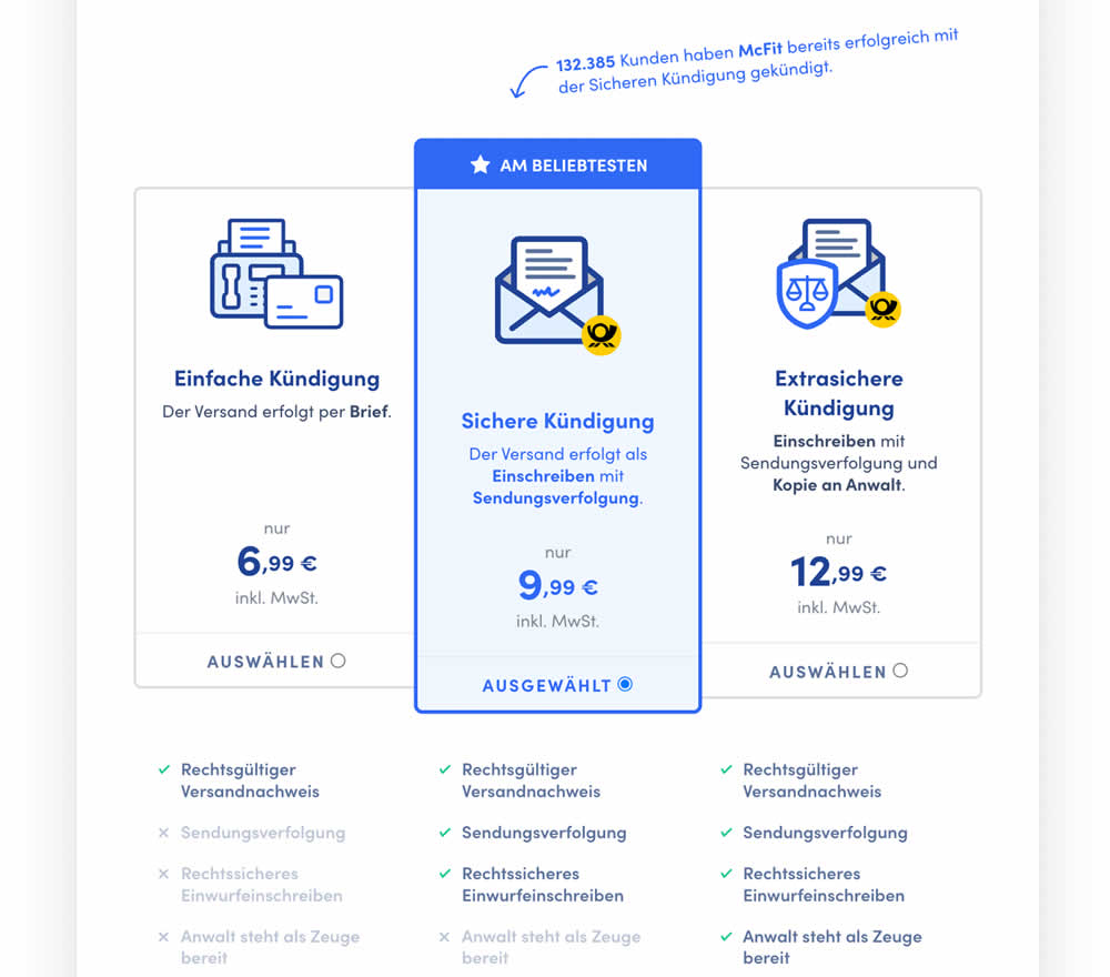 In this experiment, a "most popular" badge ("am beliebsten") was appended to the middle plan of a contract cancellation service. Impact on overall purchases and revenue was measured.