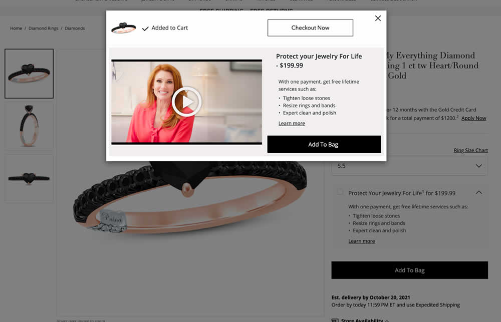 In this experiment, a protection plan was launched as a modal for customers that clicked add-to-cart without choosing the upsell. Impact on adds-to-cart and sales was measured.