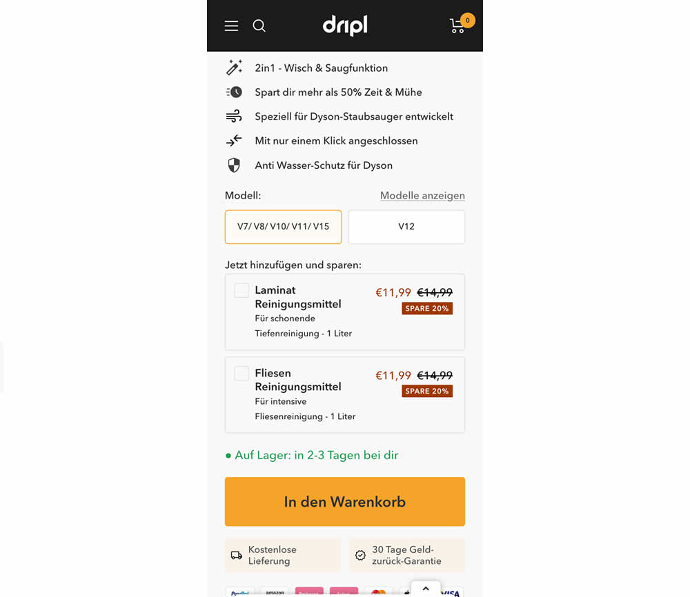 In this experiment of a floor cleaning product, a reassurance about product uses was appended to two cleaning agent upsells. In the control users saw the 2 standard upsells for laminate and tiles. And in the variation the copy "Right for me. 100x Cleanings" (uses) was appended.