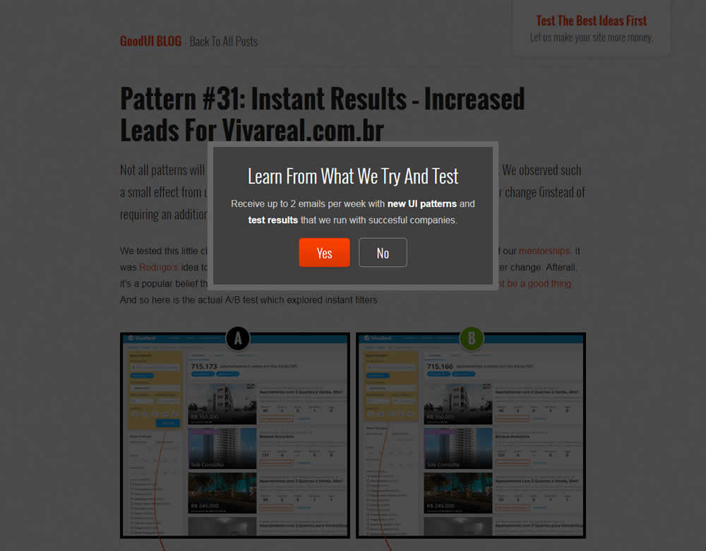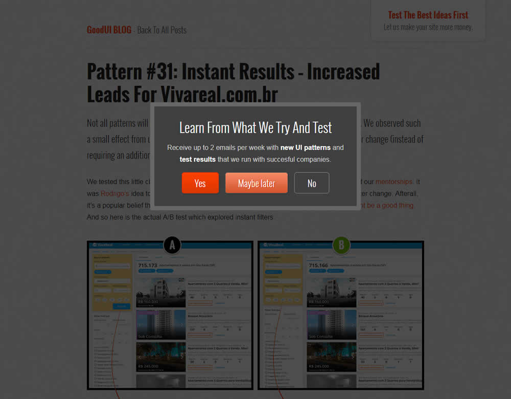 In this experiment, we tested a standard modal (with 2 choices) against a "Maybe Later" one (with 3 choices). One of the choices in the variant allowed users to postpone their decision with a "maybe" which would enable a floating bar at the bottom of the screen. Clicking on any of the "Yes" options would send people to the bottom of the screen with an email signup form. Increasing signup was our primary measure. Both modals also appeared instantly after a page load.
