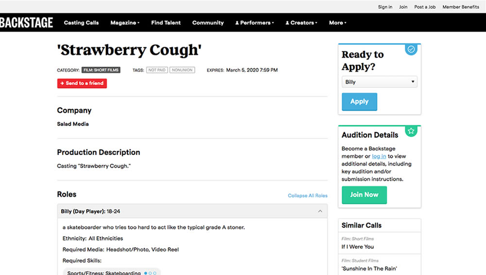 In this experiment, larger "Apply" buttons were shown on a casting detail page. The application funnel would take users through a series of steps leading to a paid membership subscription. The experiment measured initial progression and account signups (email signups).