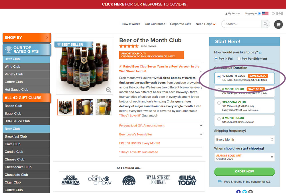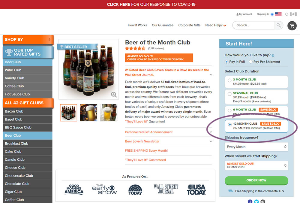 In this experiment, we tested a visible "Shipping Frequency" (A) option against a progressively displayed one (B) that would only appear after someone first chose a duration option. Thus in variation B, the buy box component would initially appear with fewer fields and smaller. The experiment measured initial progression and actual sales.