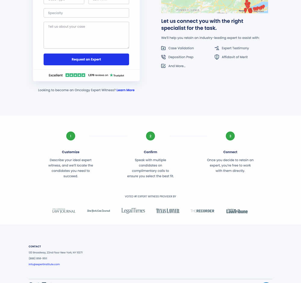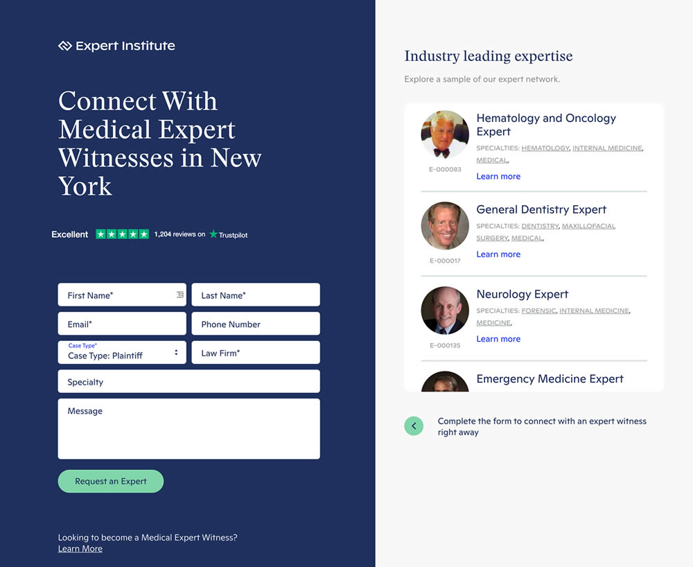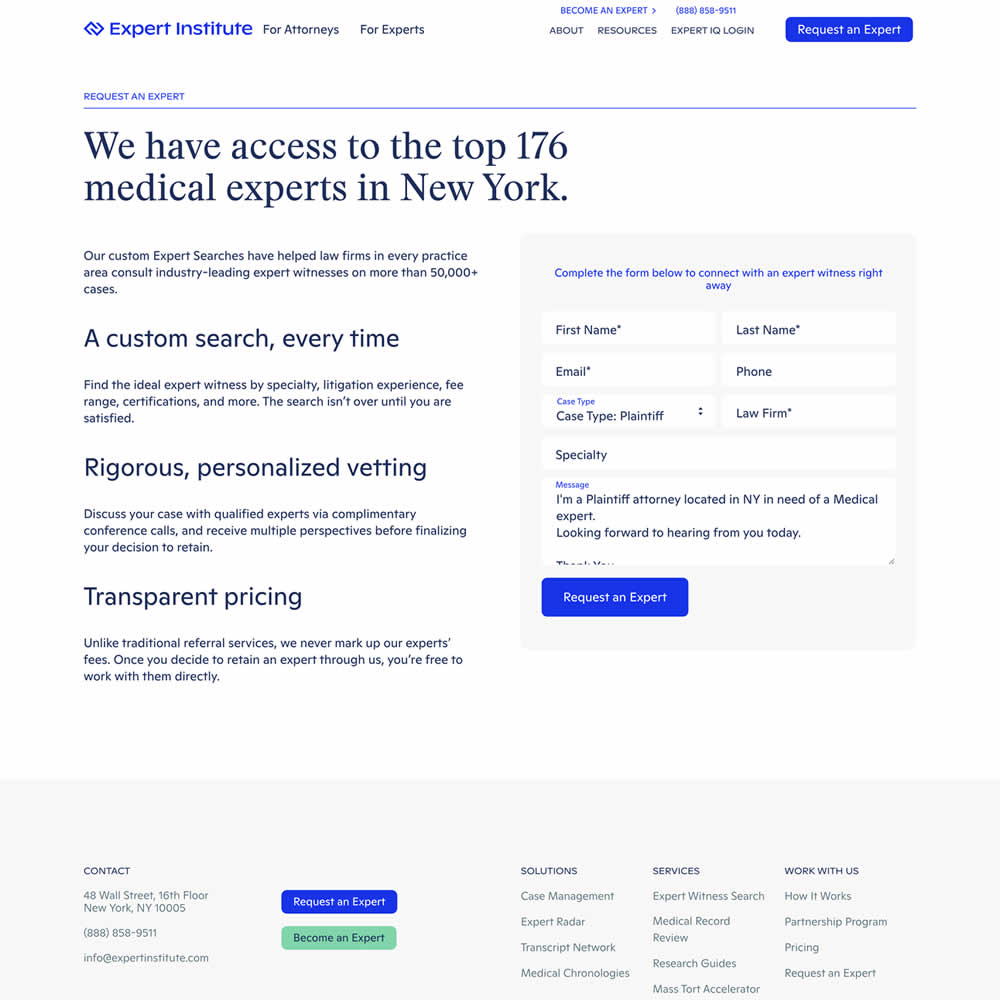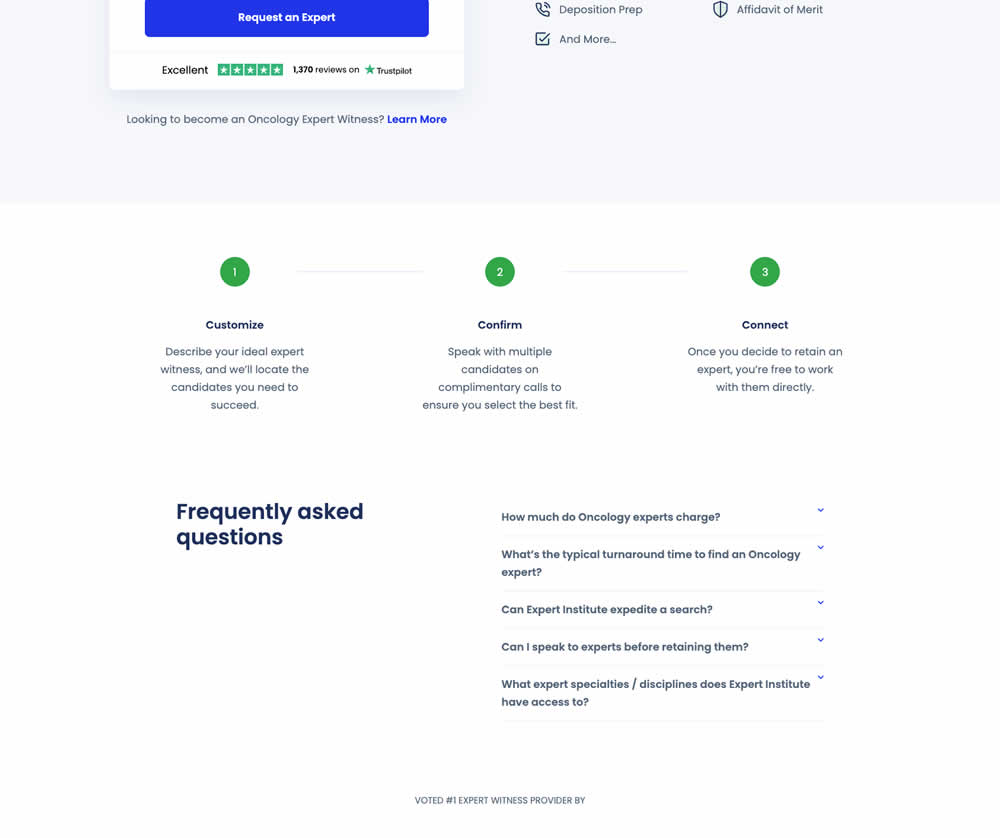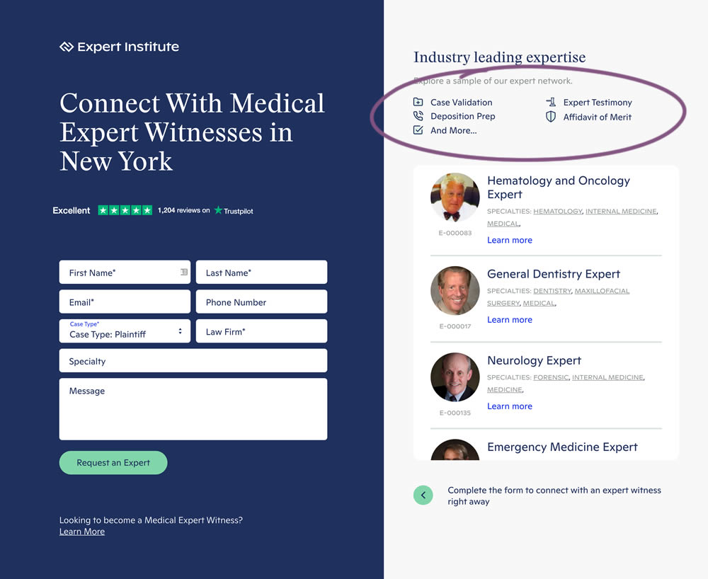 In this experiment, a Frequently Asked Questions section was added near the bottom of a short lead gen form. This test ran on one of Expert Institute's landing pages for their expert witness seeking services. Impact on leads was measured.