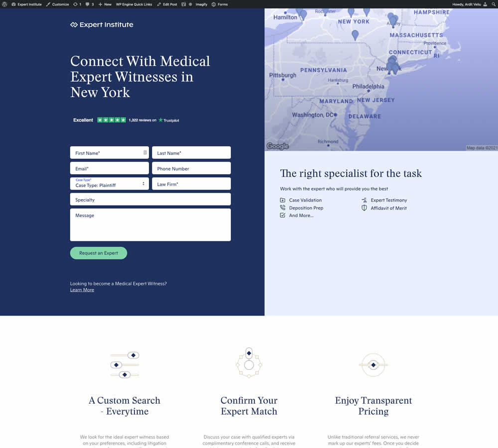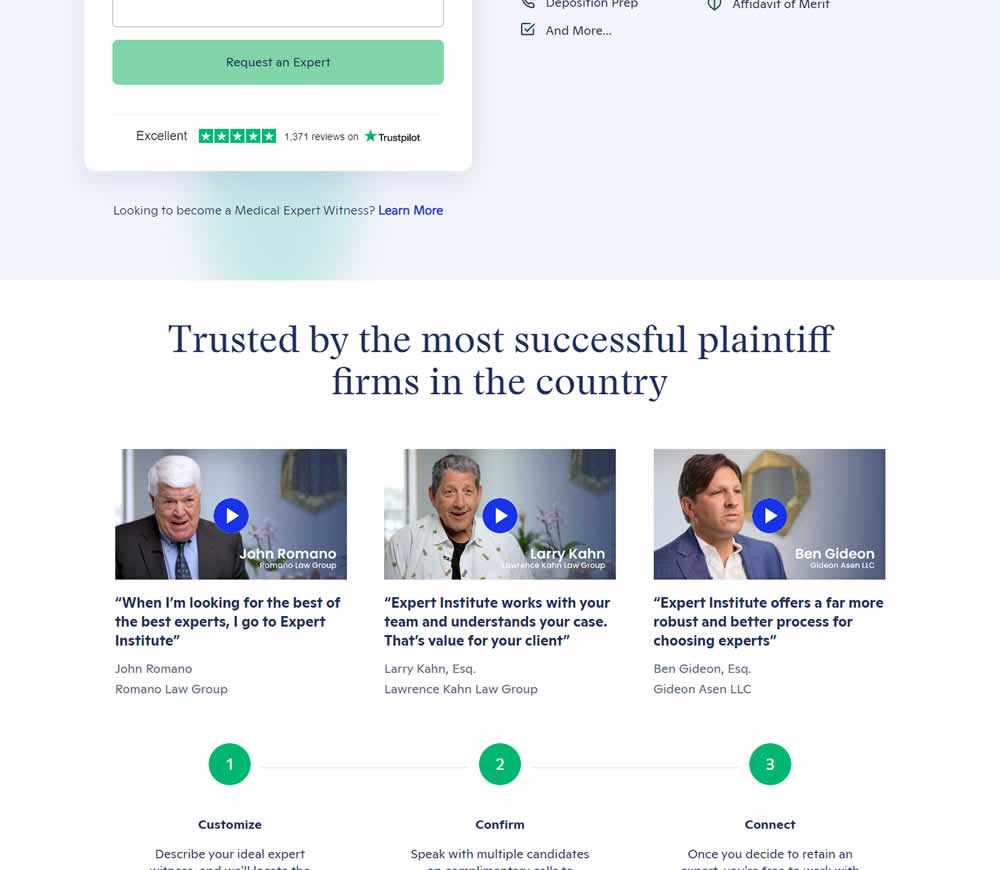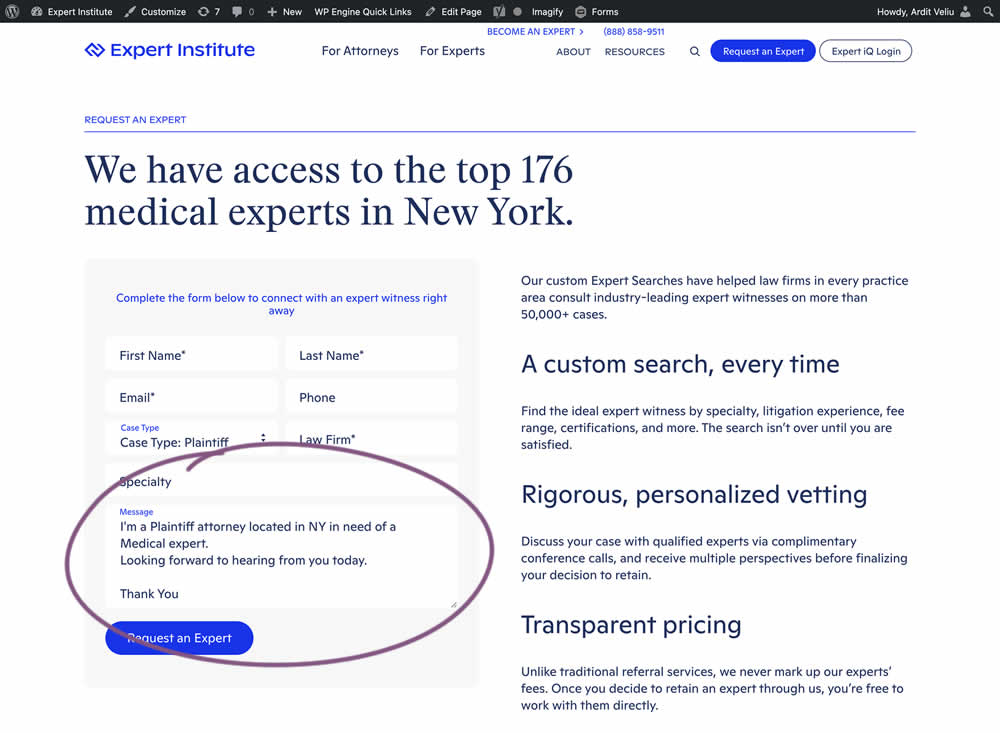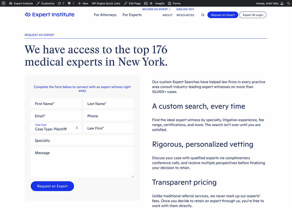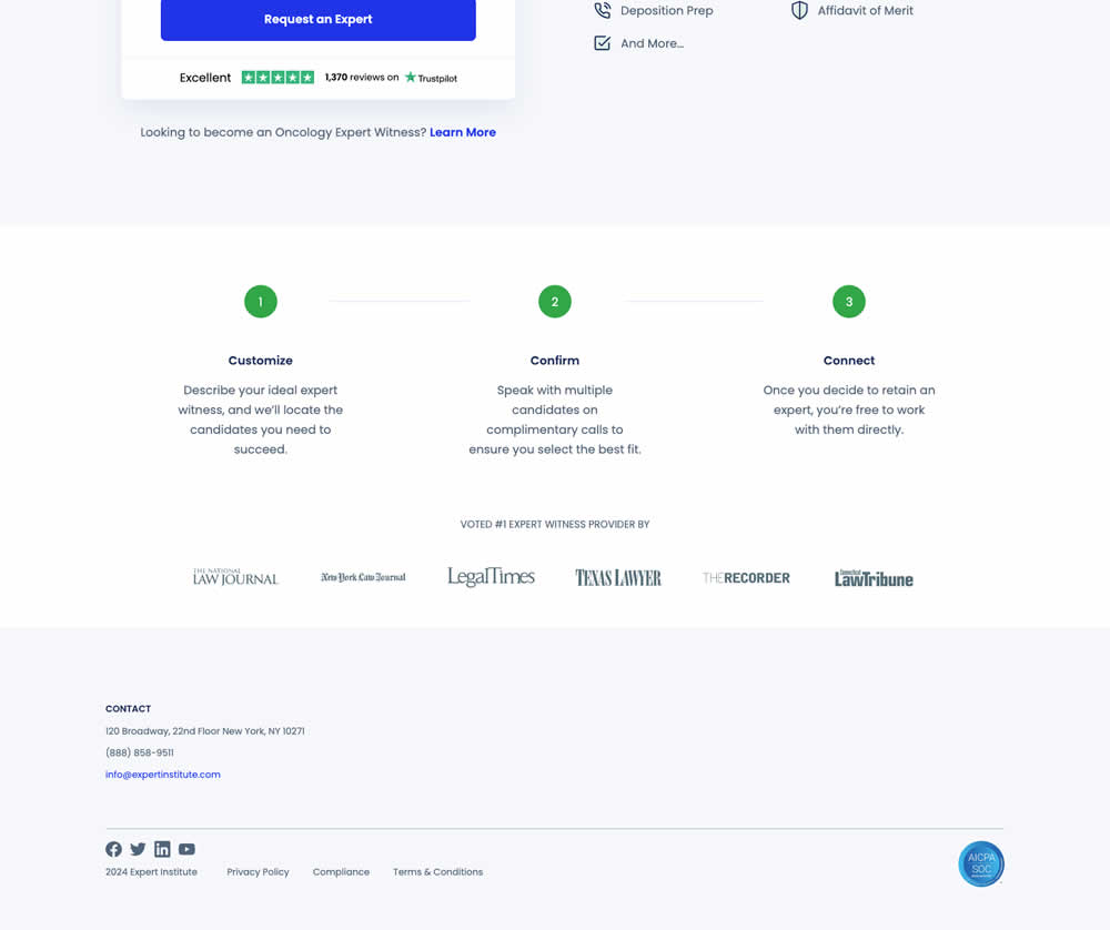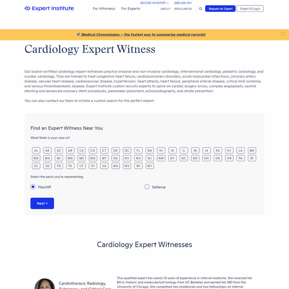 In this experiment, a Frequently Asked Questions section was added near the bottom of a short lead gen form. This test ran on one of Expert Institute's landing pages for their expert witness seeking services. Impact on leads was measured.