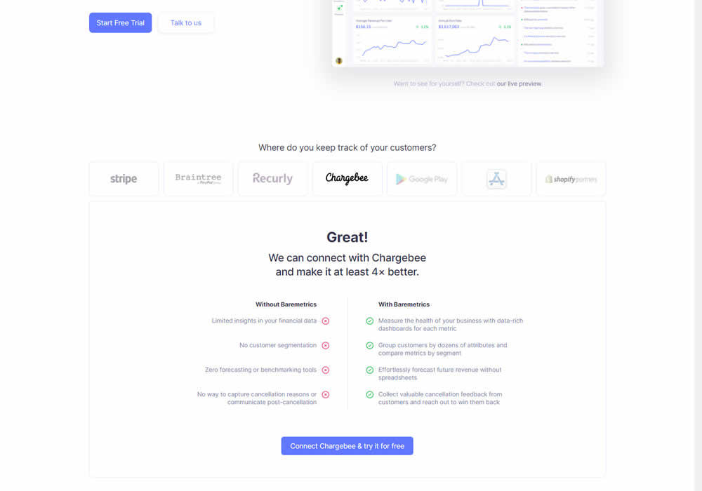 In this experiment, static integration logos were replaced with selectable ones that reassured users to signup. After clicking an integration logo, a comparison chart would appear showing how Baremetrics improves upon a selected payment processor, along with a call to signup. Impact on signups was measured.