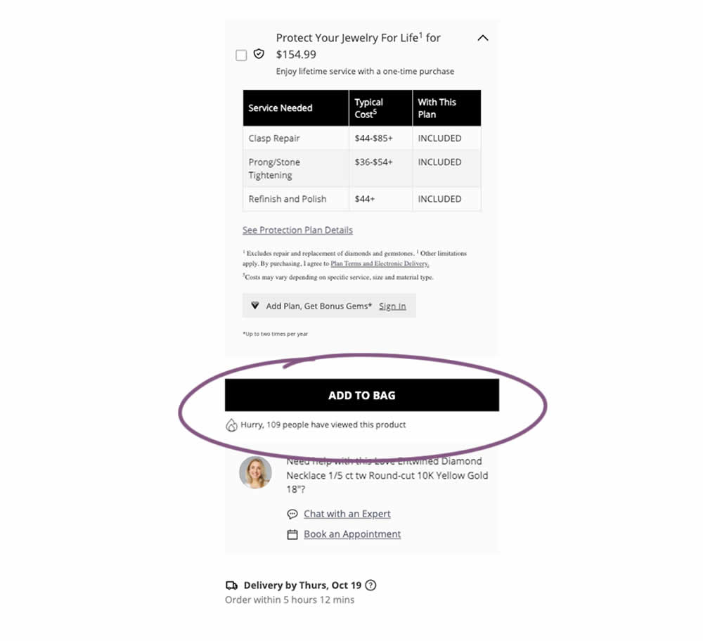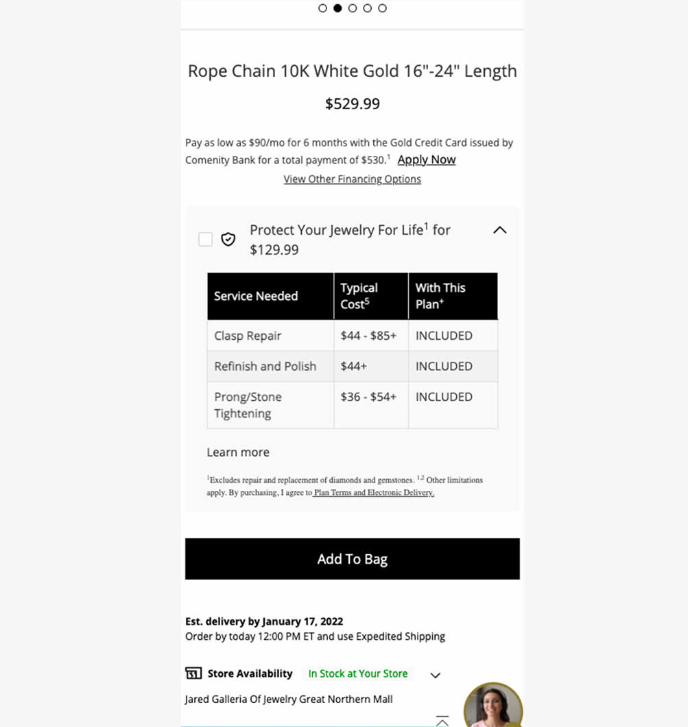 In this experiment, typical dollar values of typical coverages for an extended protection plan were shown. This ran on a product page of a jewelery site. Impact on on adds to cart, sales and uptake of the upsell was measured. Traffic split was 25/75.