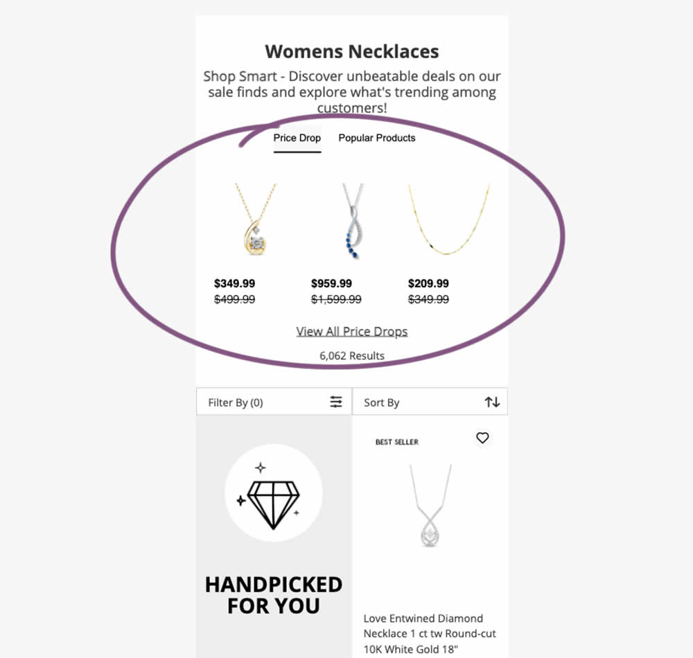 In this experiment, additional (discounted) products were shown at the top of category listing pages with a link to see more such products ("View All Price Drops"). Impact on overall sales was measured.