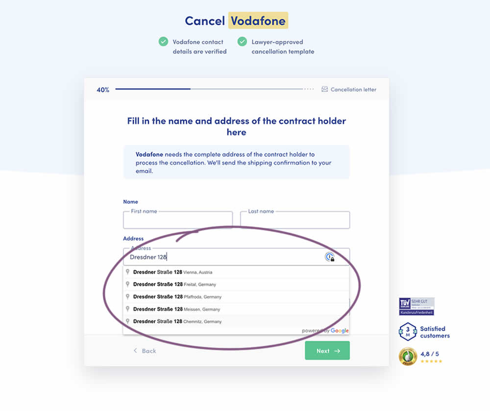Does adding Google's address auto complete functionality to an address field help with higher form completions? This auto fill feature has been tested in the variation of a contract cancellation funnel. After selecting an auto completed address from a pulldown menu, the following fields were preselected: house number, zip code, city and country (potentially lowering friction?). Impact on successful form completions (contract cancellations) has been measured. Notice how the form also expanded progressively upon selecting the complete address in the variation.