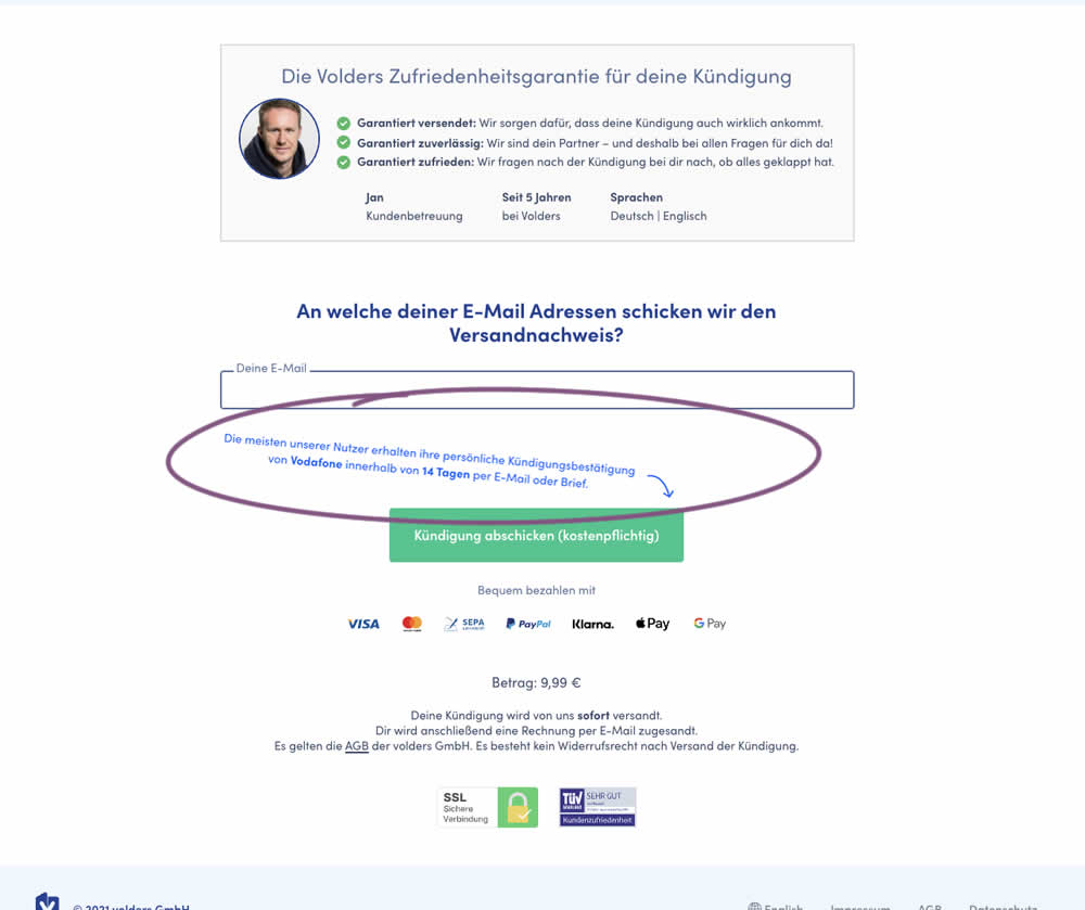 The variation contained additional copy translated from German to: "Most of our users receive their cancellation confirmation from <vendor> within 14 days by email or letter."