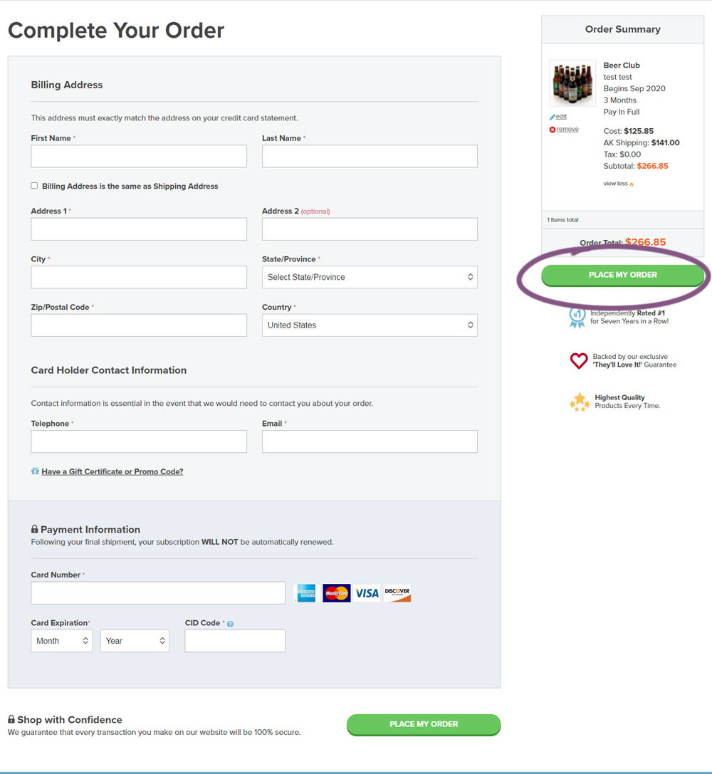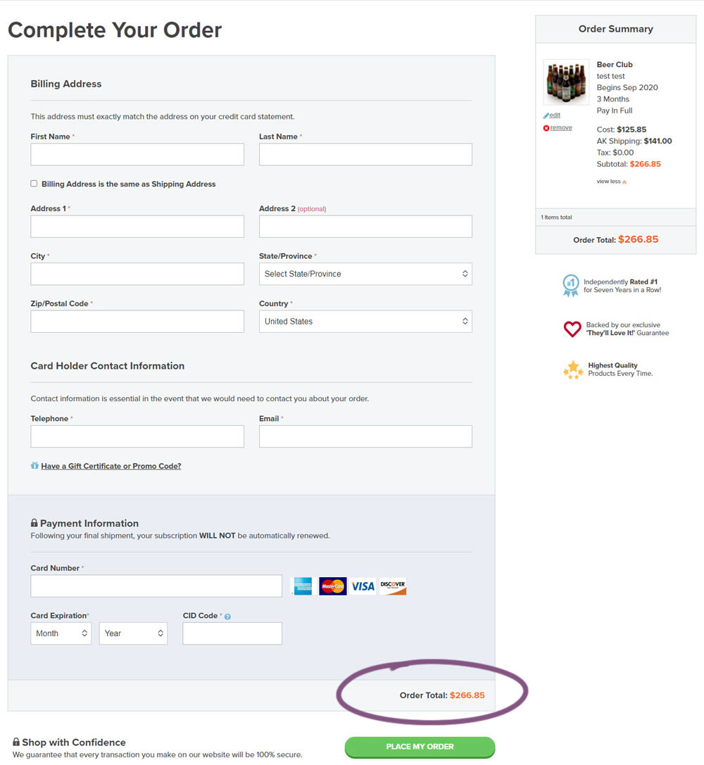 An extra "Place Order" button was duplicated above the fold on this checkout page. The control had a similar button further down at the bottom of the screen. The impact on total sales was measured from this change.