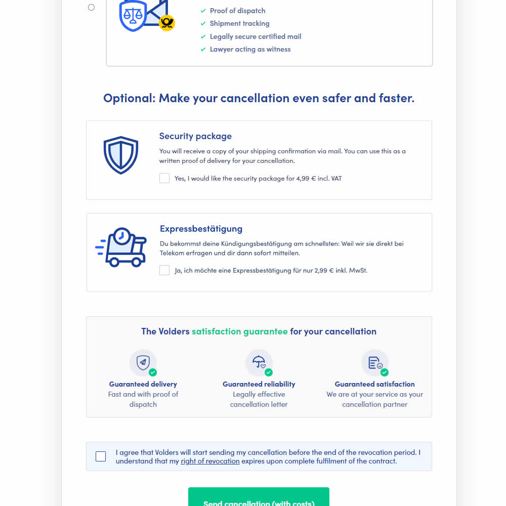 In this experiment, reassuring copy was added to 2 of 3 pricing plans of a contract cancellation service. The copy was translated as "Cancellation guarantee. Contract cost coverage and legal support included!” Impact on overall revenue was measured.