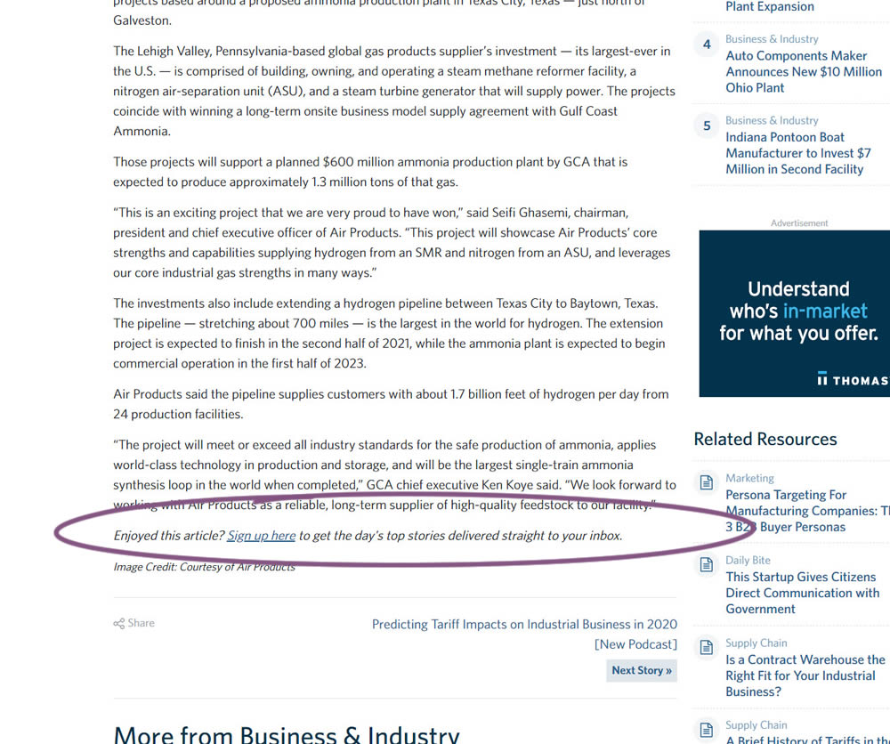 In this experiment, a simple link to a newsletter signup landing page was added at the bottom of an article. The newsletter landing page then encouraged users to provide their email address for future article updates.