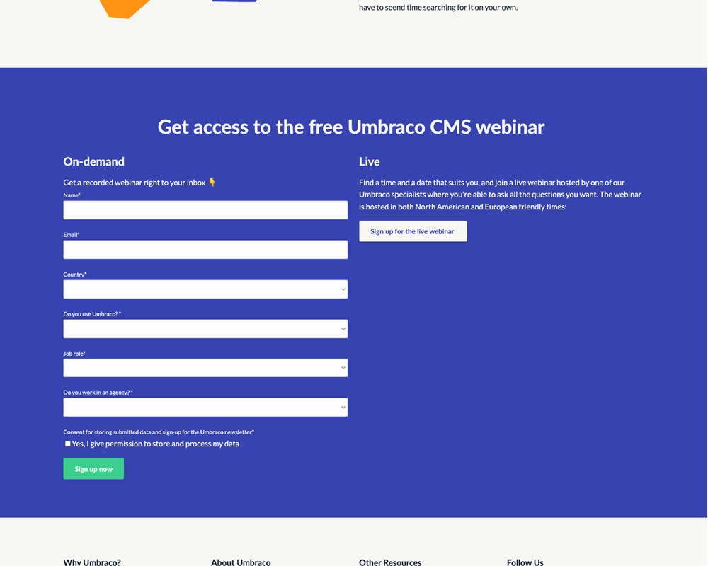 In this experiment, a trial signup section was added at the bottom of Umbraco's long homepage (CMS business). The experiment measured the impact on trial signups.