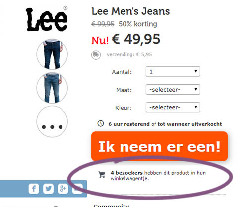 In this experiment, realtime social proof information has been added below an add-to-cart button. The variation shows how many users that have viewed, or placed a product into their basket. Translated to "4 visitors have this product in their shopping cart."