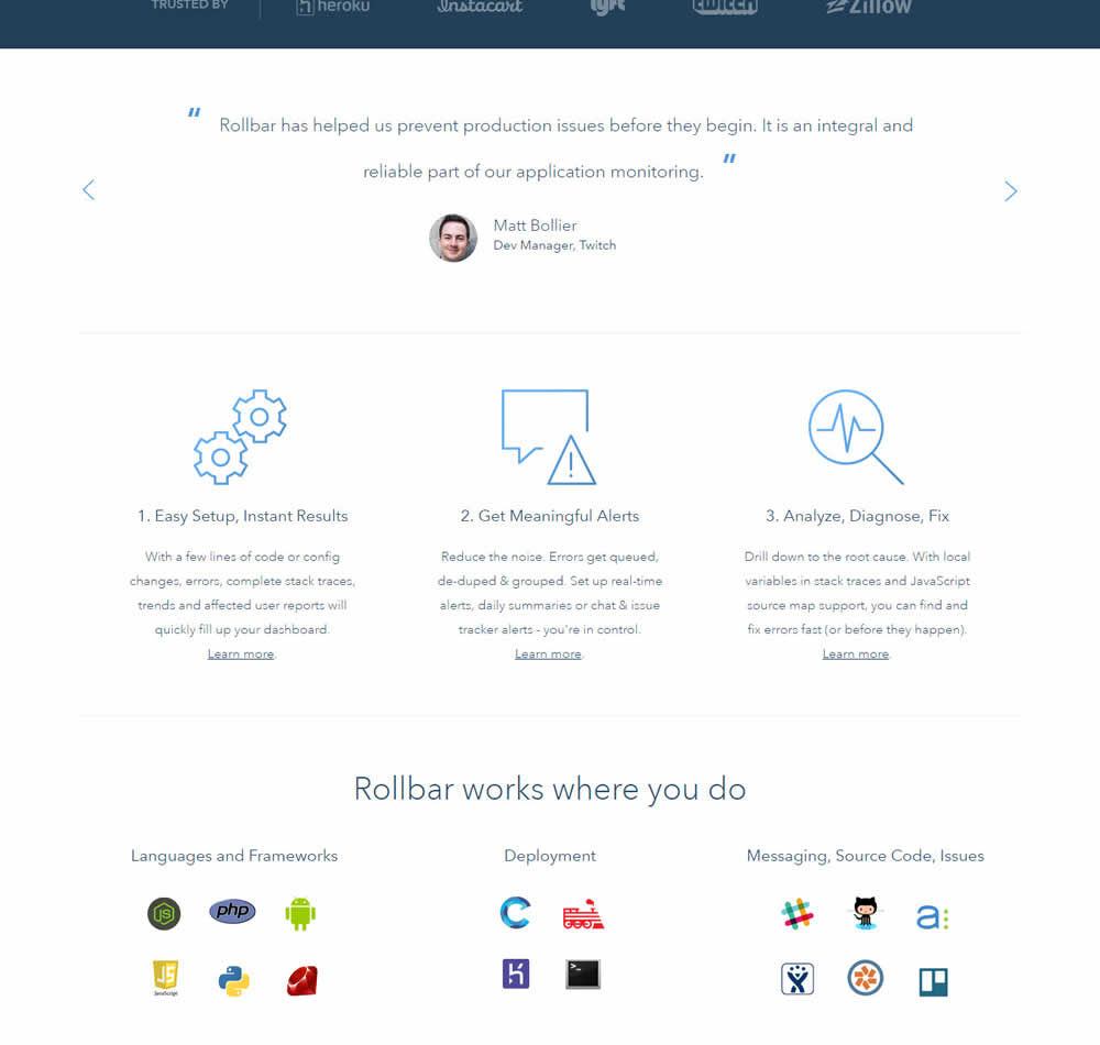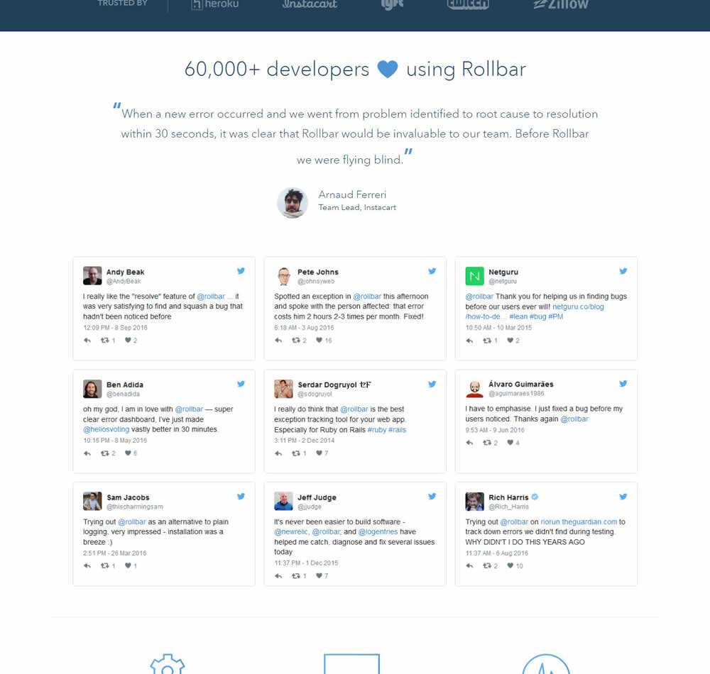 In this experiment, 9 Twitter card style testimonials were appended onto the homepage of Rollbar. These were image / screenshots recreations without links to the actual tweets.