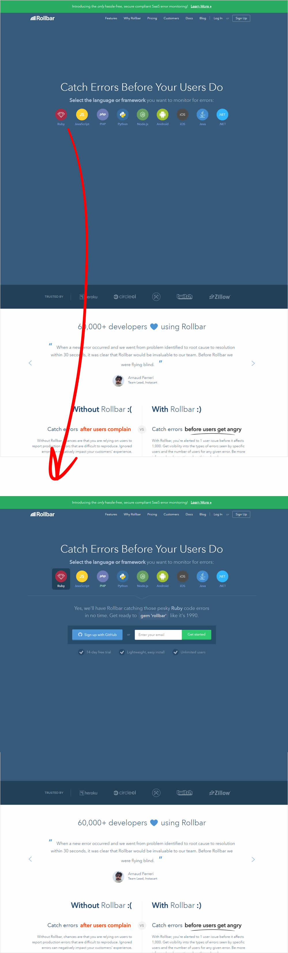 Mike Smith Tested Pattern #22: Empowering Headline In Test #173 On Rollbar.com