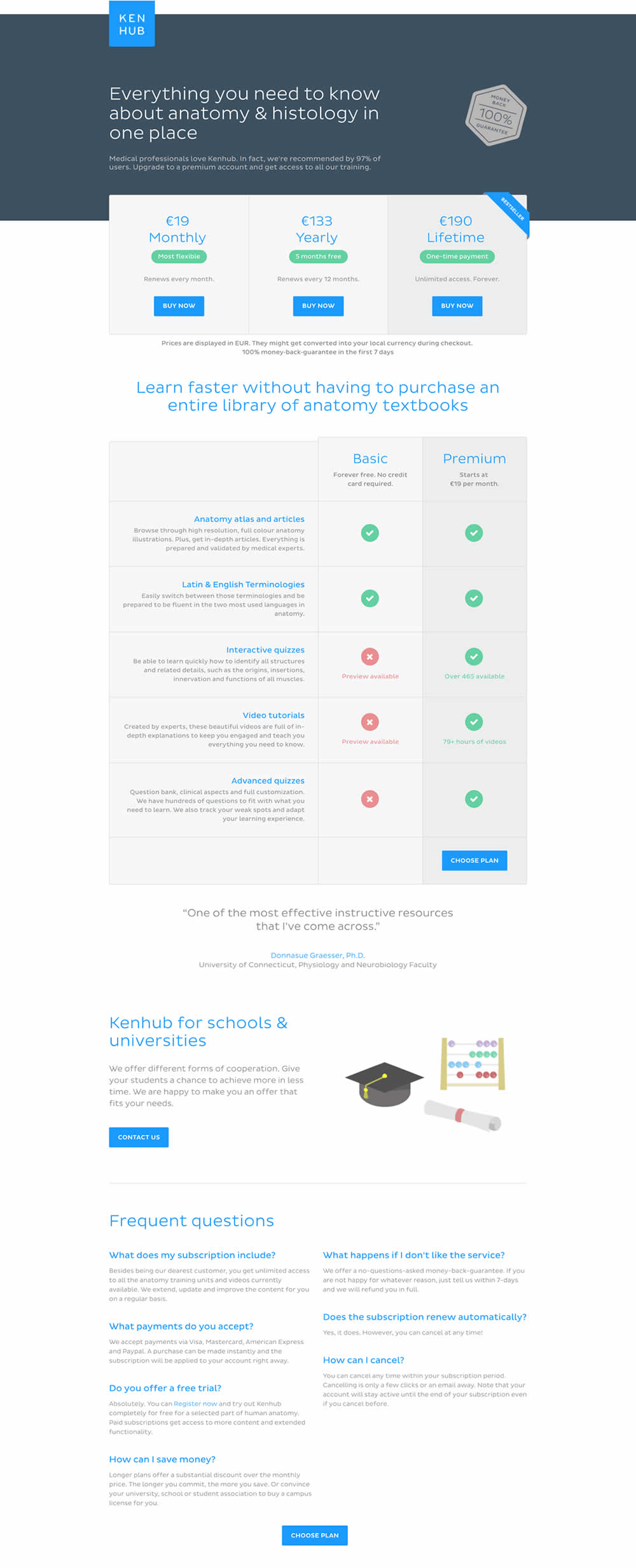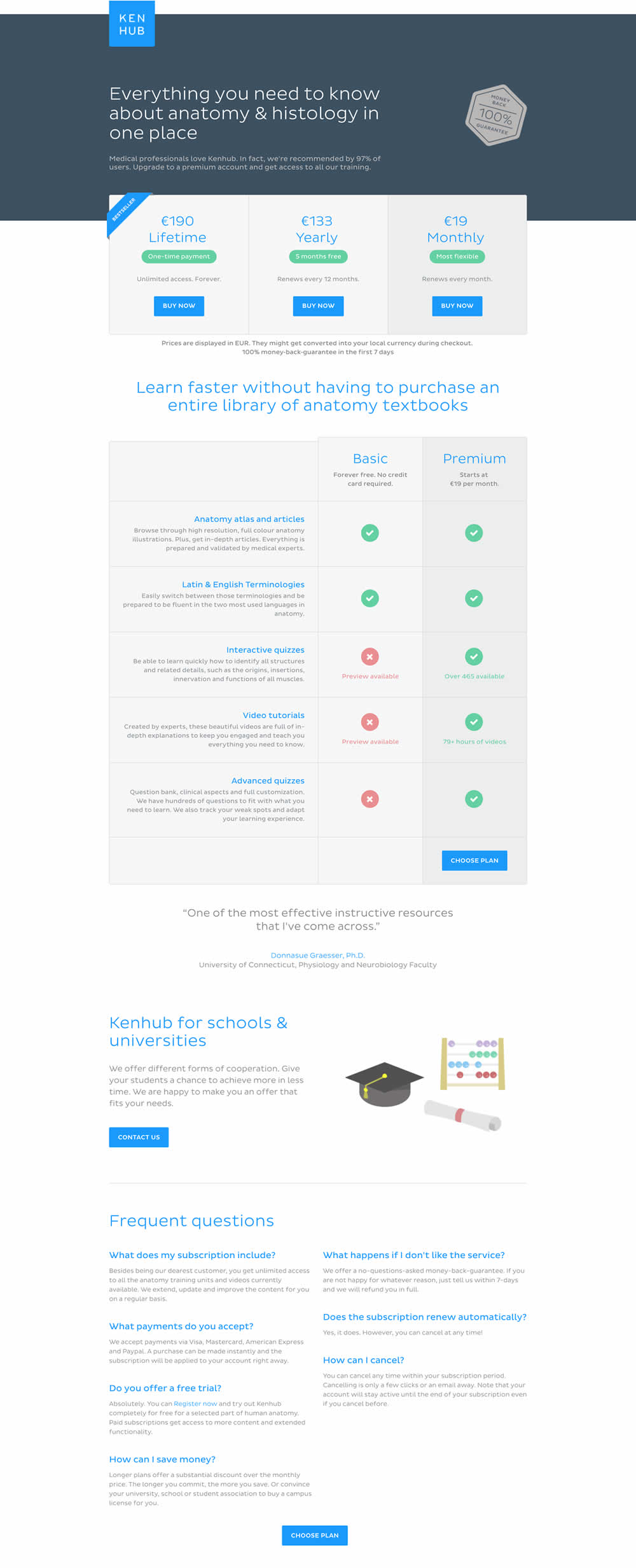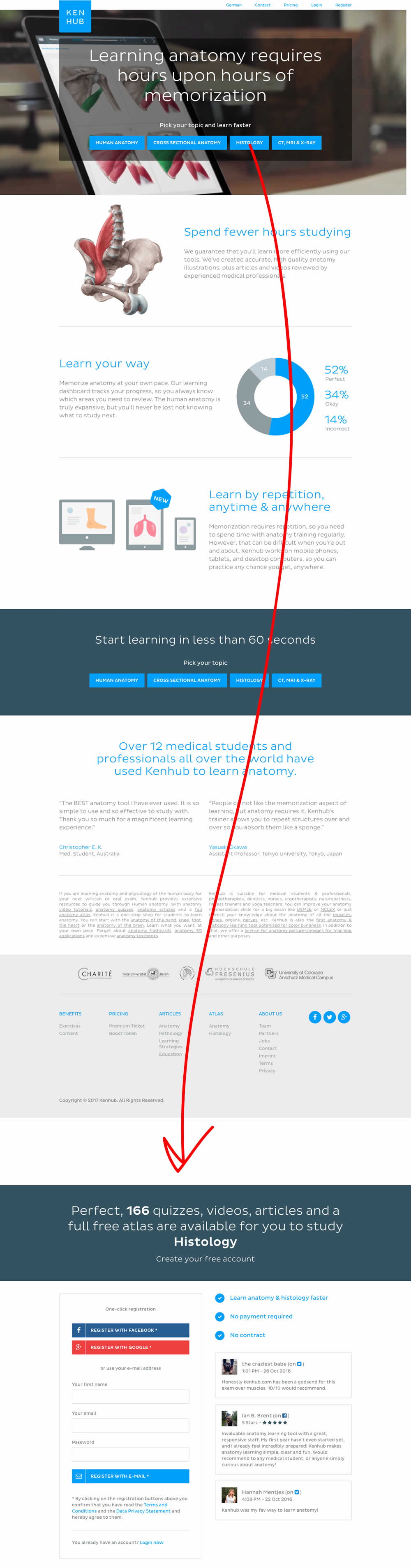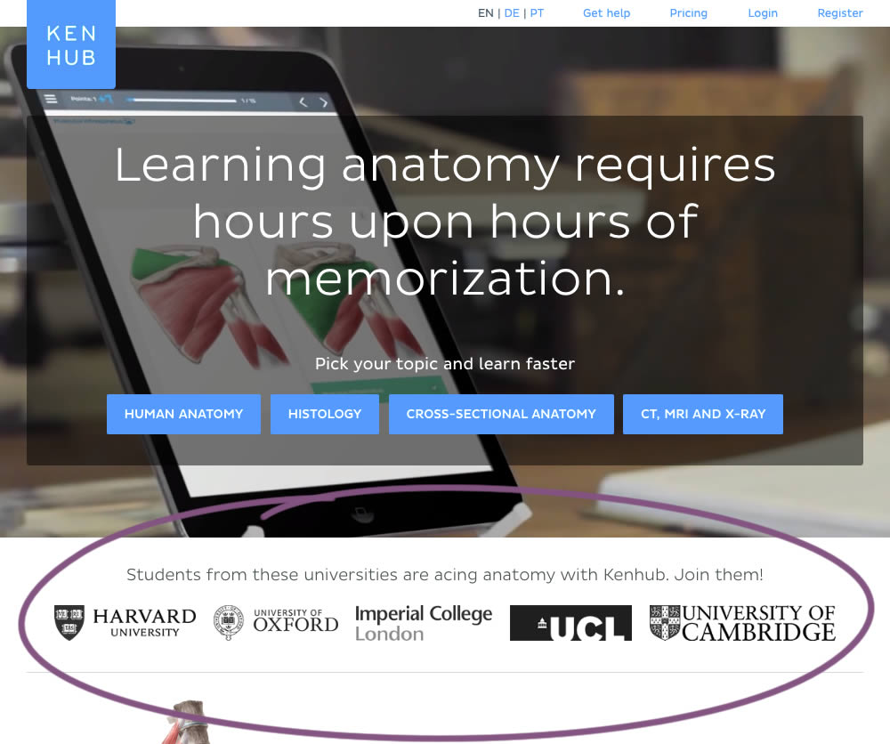 In this experiment, customer logos (of universities attended by students using Kenhub) were placed on a homepage. The experiment tested for the effect on registration visits, and premium subscription starts.