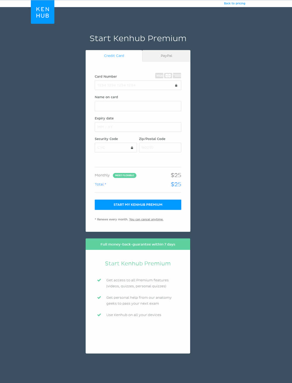 In this experiment, registered trial users were shown a 65 minute counter on multiple pages (dashboard, listing, quiz, articles) encouraging them to get a full subscription and study all content. Both A and B experiences offered the same limited content for trial users. After the 65 minutes came to an end, the B variation showed an additional "Go Premium" button on all pages, but continued to offer the same limited content.