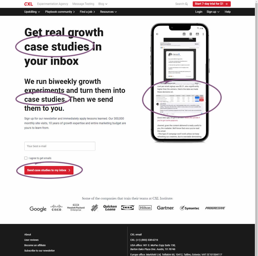 CXL ran an interesting experiment that (1) added more specificity on a newsletter subscription page as well as (2) reinforced it consistently. Most visibly, an abstract or vague headline statement (control) was changed to a benefit oriented one - hinting that subscribers will eventually receive valuable case studies. This message was further reinforced with supporting copy that explained where these case studies are obtained from along with the frequency of the delivery. This same message was also reinforced with an image of actual case studies. The call to action button was also adjusted to mimic the benefit.