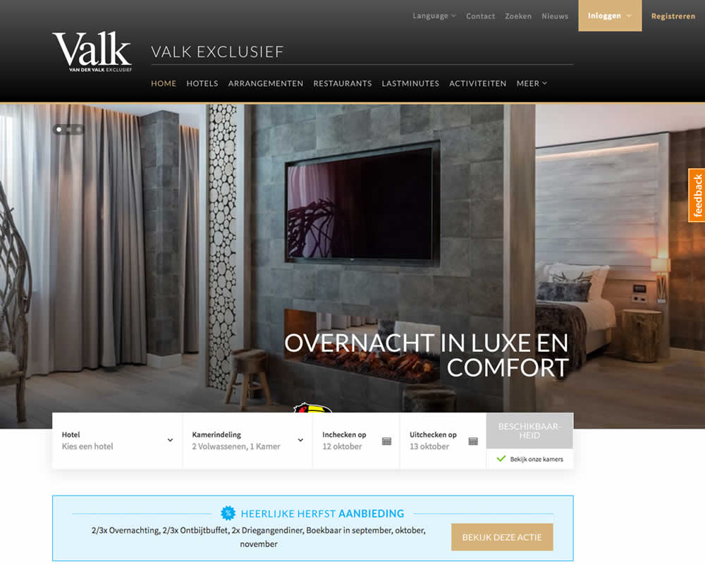 In this experiment on Valk Exclusief's web site, a transparent overview of the benefits for booking hotels was shown. The copy translates to: "Why should you book here? - 5€ Loyalty Discount - Best Price Guarantee - Discount On Packages - No Reservation Costs. Valk is a 150 year hotel chain in the Netherlands.