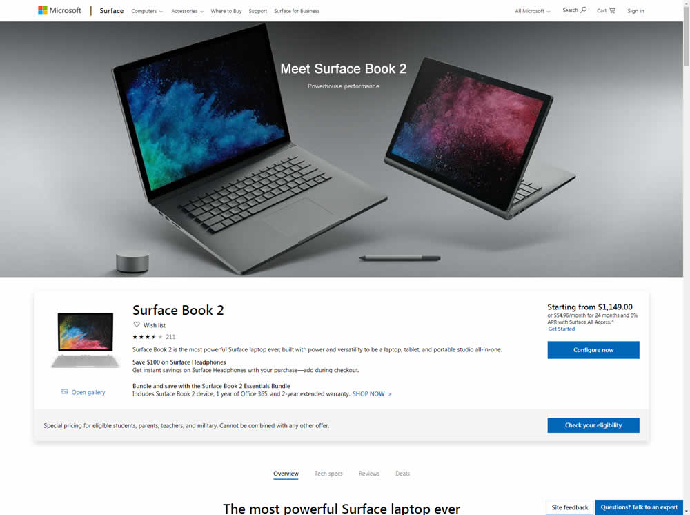 Microsoft Store ran an experiment on the Surface Book 2 product page. The treatment showed a hero image with fewer, yet larger product photos